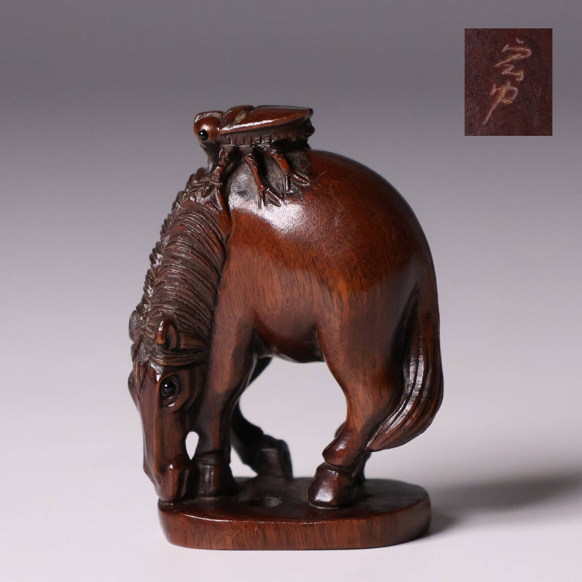 ◇木製 堤物 宏中 銘 馬 昆虫 蝉 根付【MA762】◇