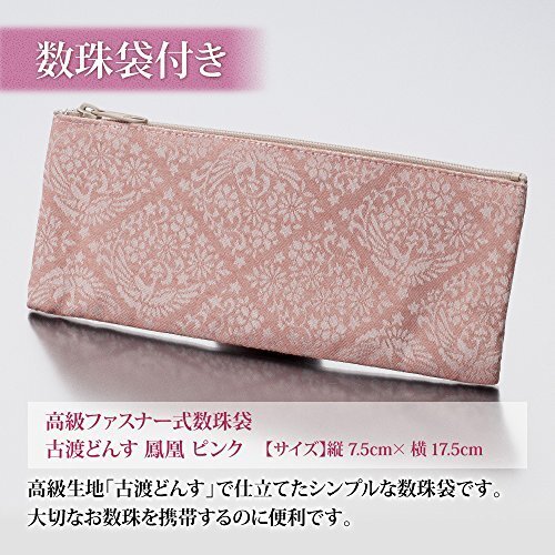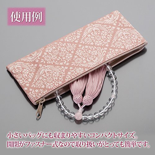 房は京都の伝統工芸である「京房ひも」の職人が製作した正絹頭付房を使用しております。小さいバッグにも収まりやすいコンパクトサイズの高級ファスナー式数珠袋をお付けします。