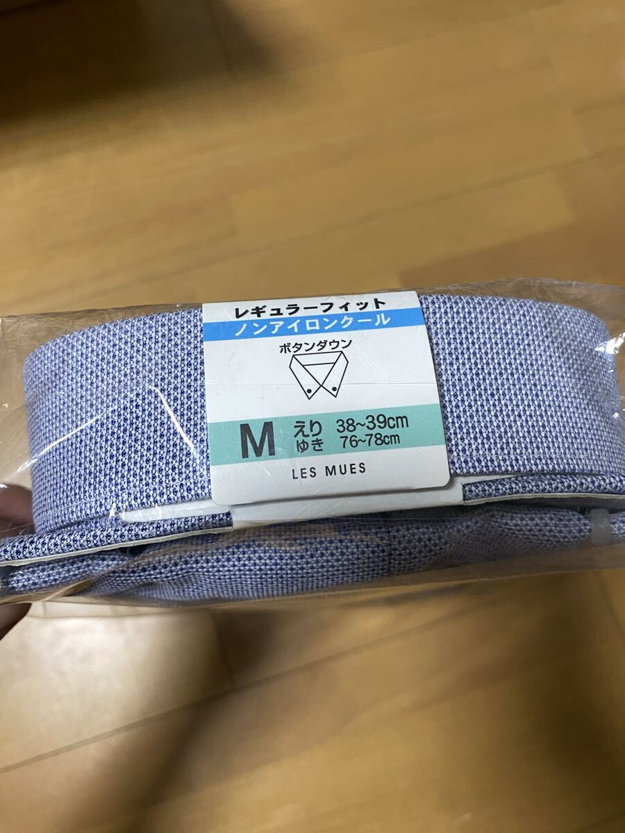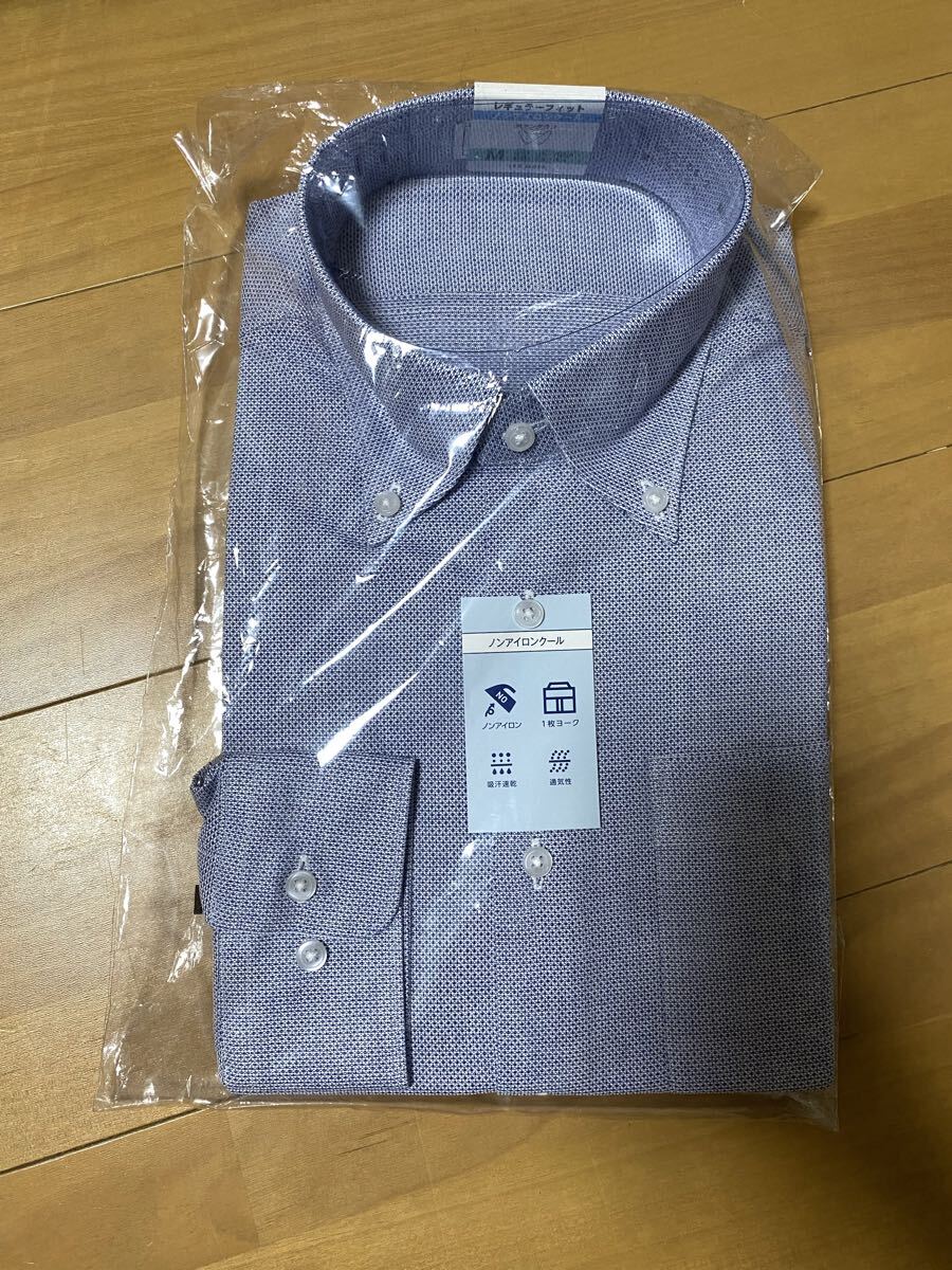 ボタンダウンデザインのドレスシャツ、Mサイズ、ポリエステル素材で快適な着心地。