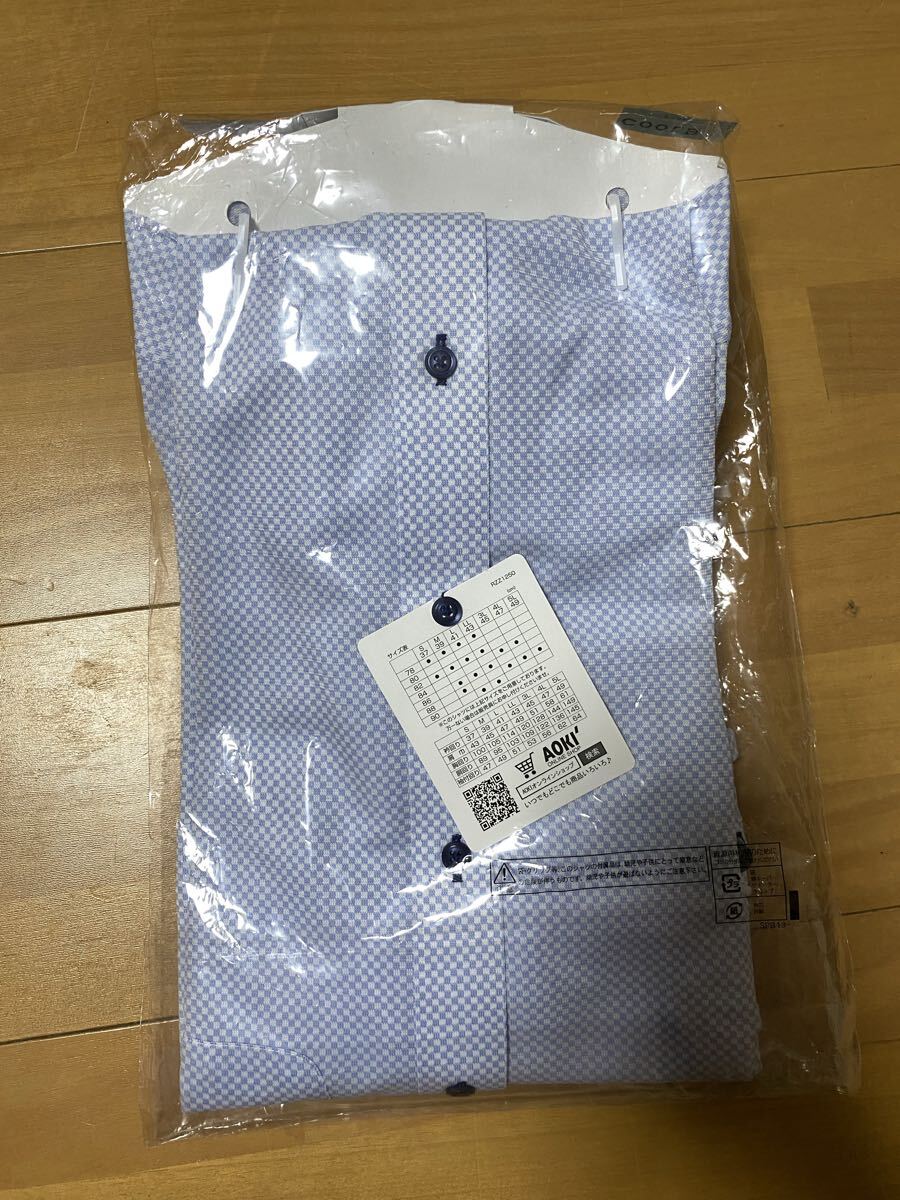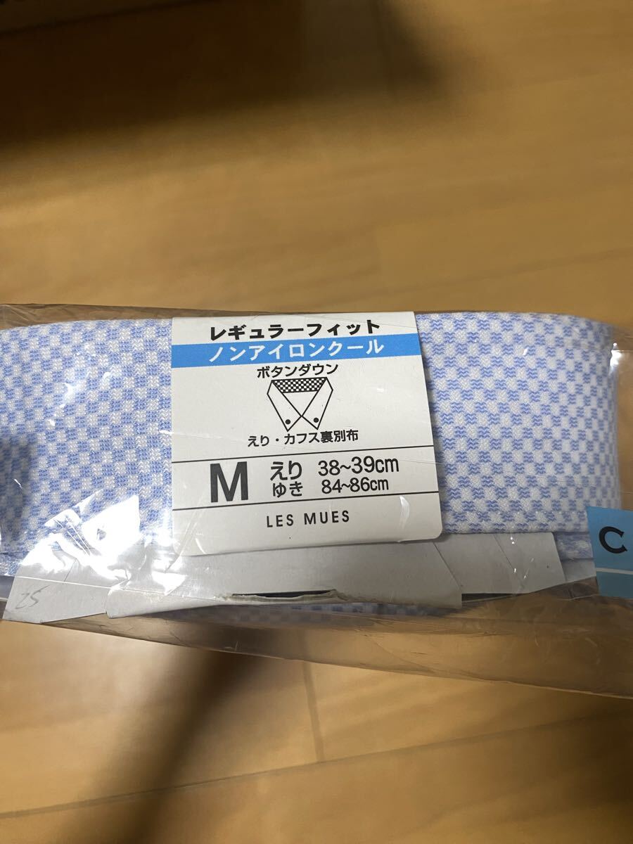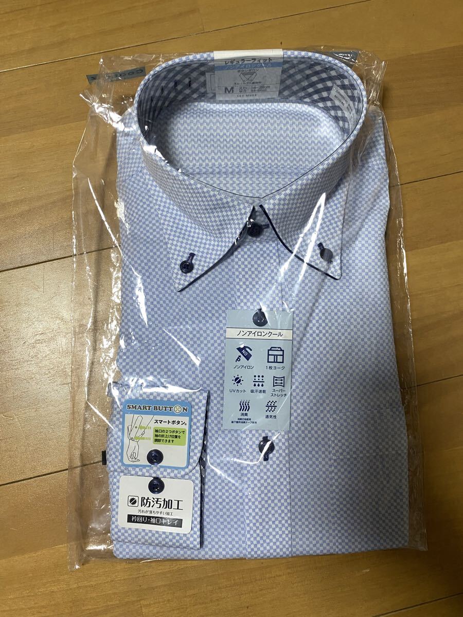 ノンアイロン加工の水色チェックシャツ、Mサイズ、快適な着心地。