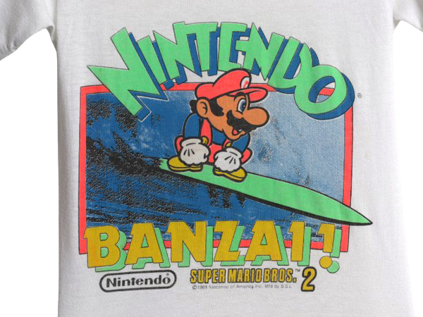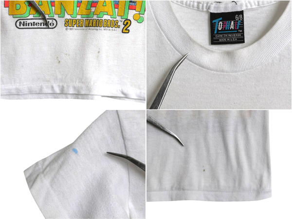 80年代ヴィンテージ 当時物 任天堂オフィシャル スーパーマリオブラザーズ 2 のプリントTシャツです。 ボディは、TOPHALF 任天堂などのライセンスをTシャツを製造していた会社で コレクターズの市場ではTOPHALFが 1980年代末の正規品の証拠となるタグが付きます。 1989 Nintendo of America Inc. Mfd by S.S.I.のコピーライト入り。 素材は、50% COTTON / 50% POLYESTER。 柔らかい着心地抜群の素材が使用されています。 MADE IN USA (アメリカ製) 裾・袖共にシングルステッチのヴィンテージボディー フロントにはNINTENDO BANZAI!のメッセージと 人気キャラクタースーパーマリオがサーフィンしているプリント入り。 コストのかかる細かいタッチの多色刷り スーパーマリオブラザーズ2は 日本では1986年にディスクシステム版 アメリカではSUPER MARIO BROS. 2として1988年にリリースされ その当時のプロモーションとして販売されていたTシャツと思われます。 特にSUPER MARIO BROS. 2のTシャツは 市場でもまったく見かけない非常にレアなアイテム。 マニアの市場でも高額で取引される 世界的人気のニンテンドーアイテム。 インパクトのあるグッドデザイン マニアの方のコレクションにもおすすめ ディスプレイとしても映える これだけで様になる商品です |