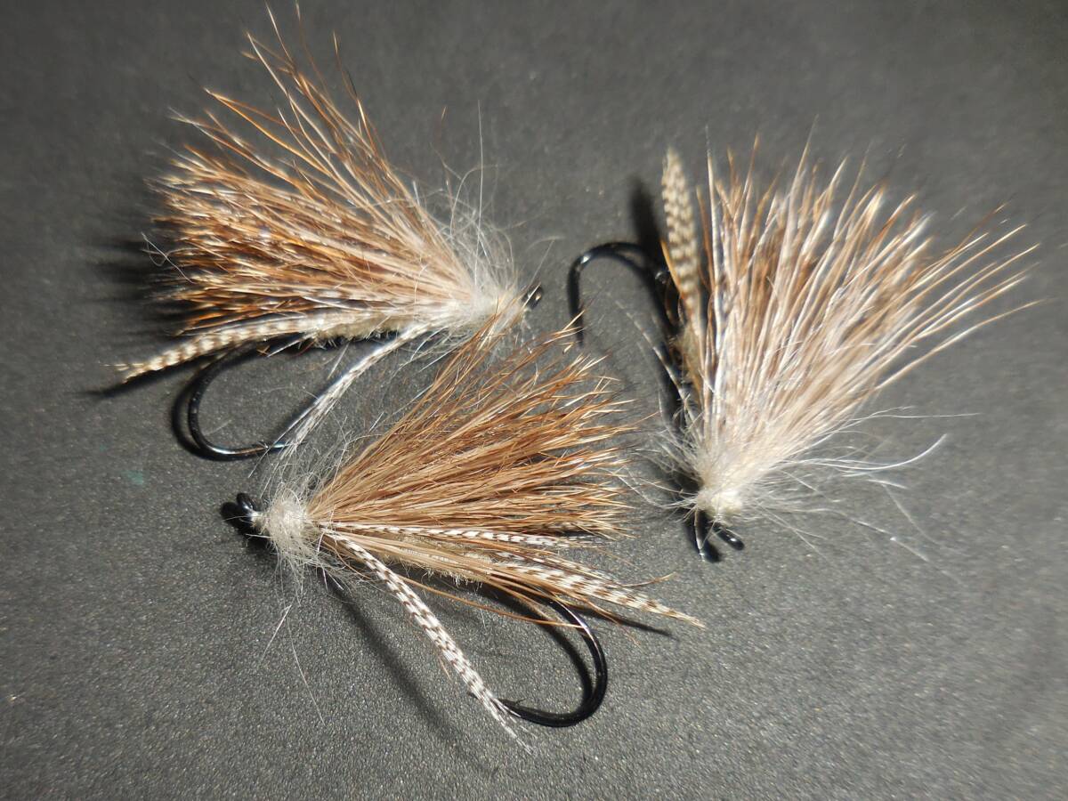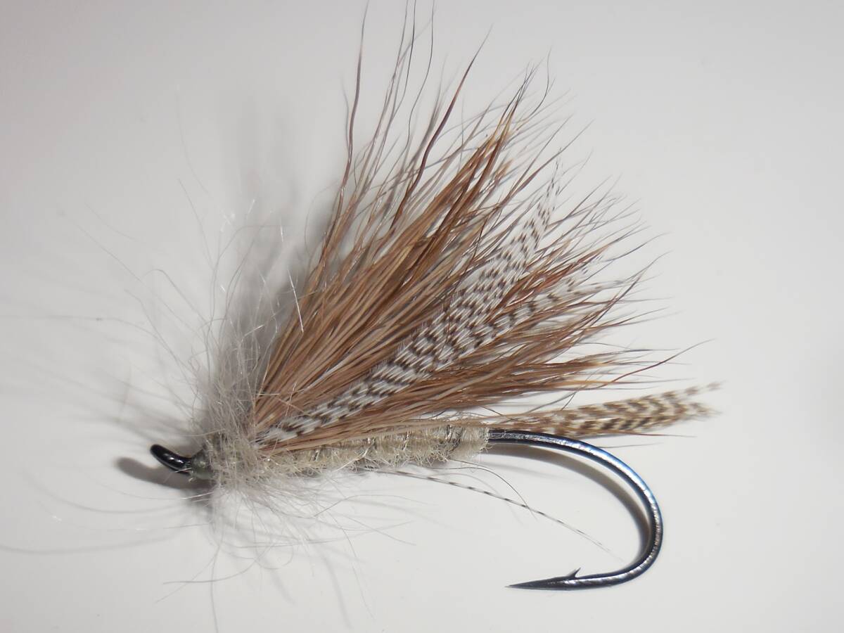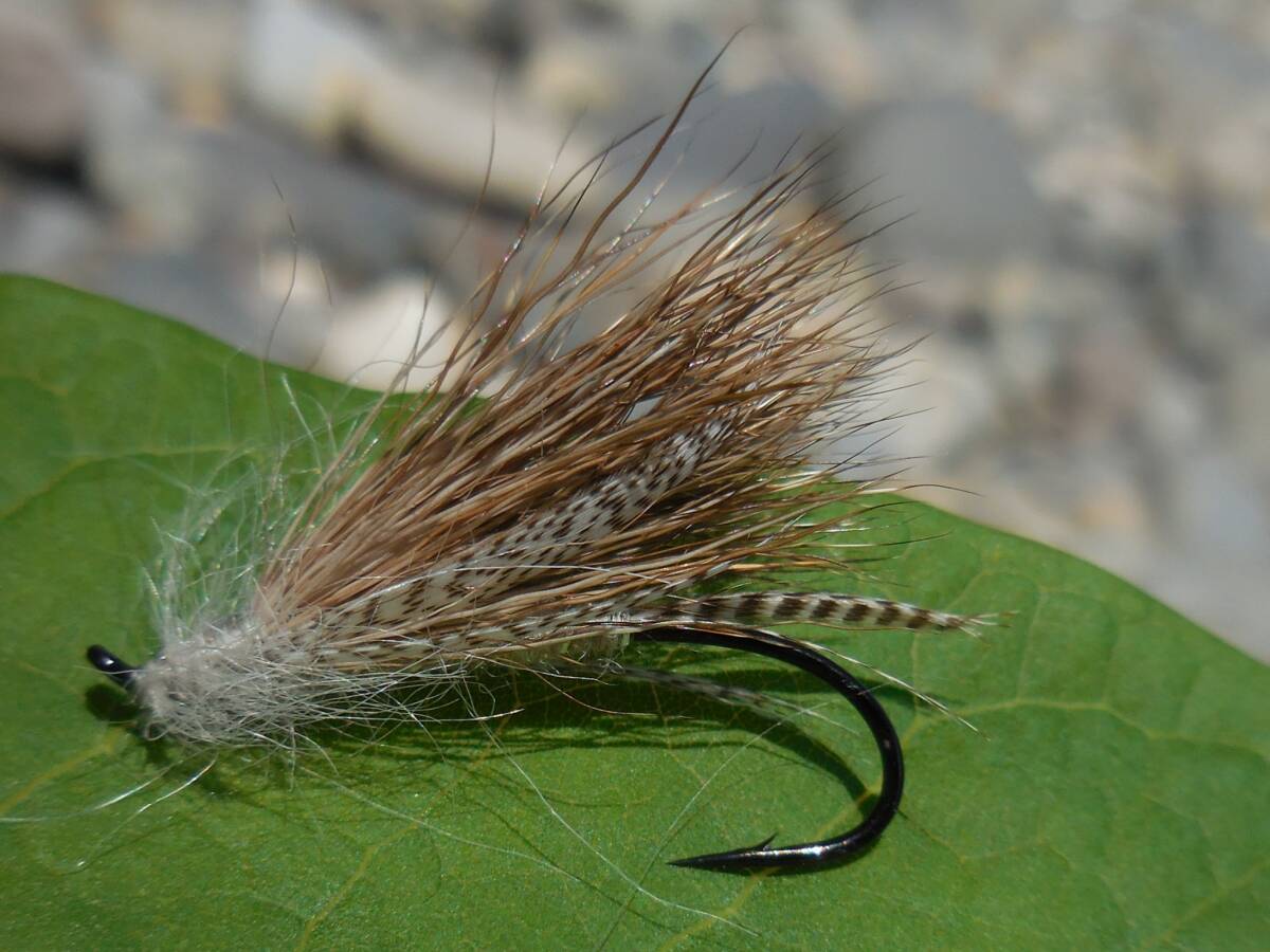 近年多く見られる白っぽいマイマイガ、釣り場でもパタパタ飛び回り、風で落下すると大きなライズが起こるのを何度か見ています。色合いはヒゲナガにも通用するように仕上げていますので、夏~秋の長い期間使用できます。