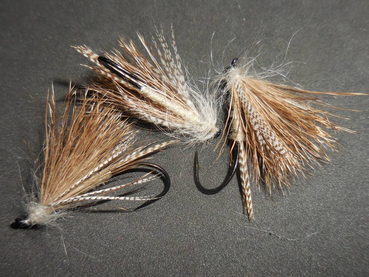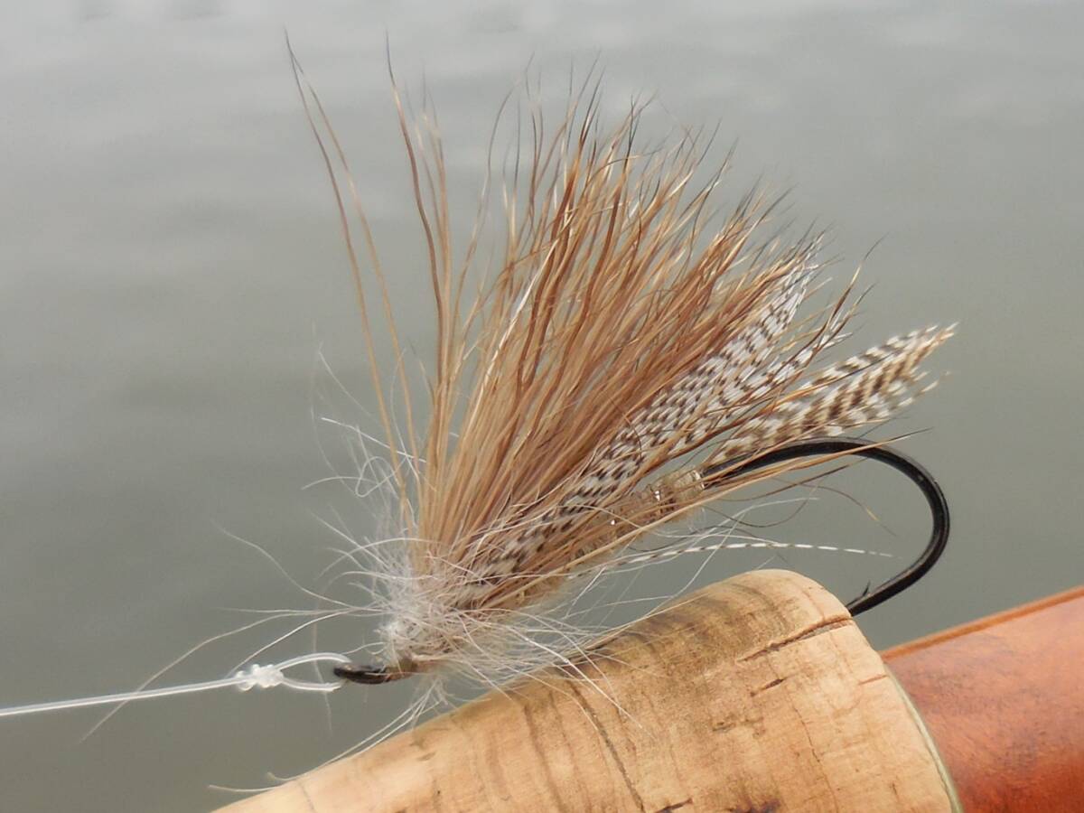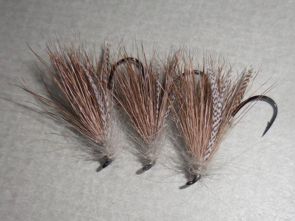 近年多く見られる白っぽいマイマイガ、釣り場でもパタパタ飛び回り、風で落下すると大きなライズが起こるのを何度か見ています。色合いはヒゲナガにも通用するように仕上げていますので、夏~秋の長い期間使用できます。