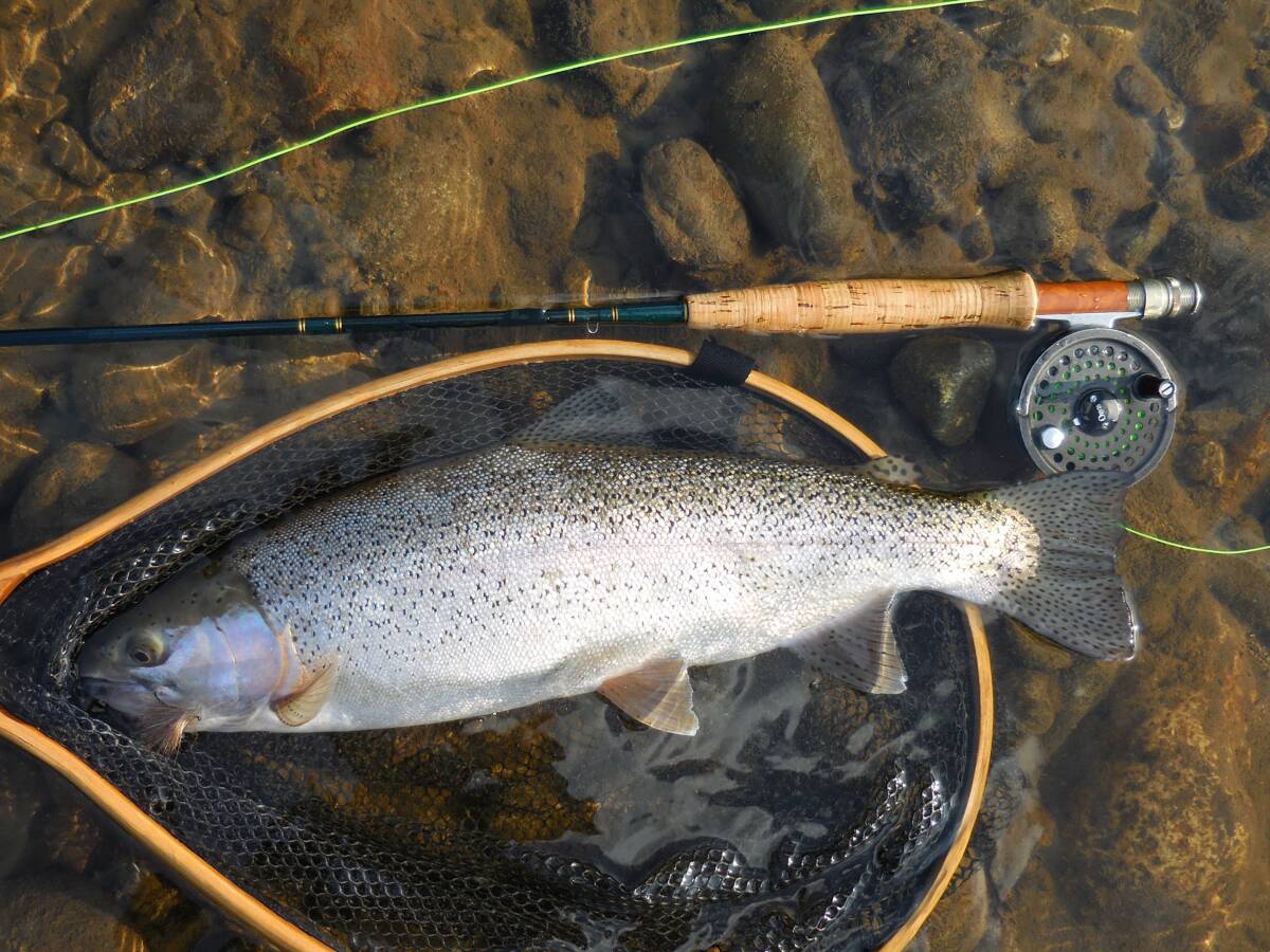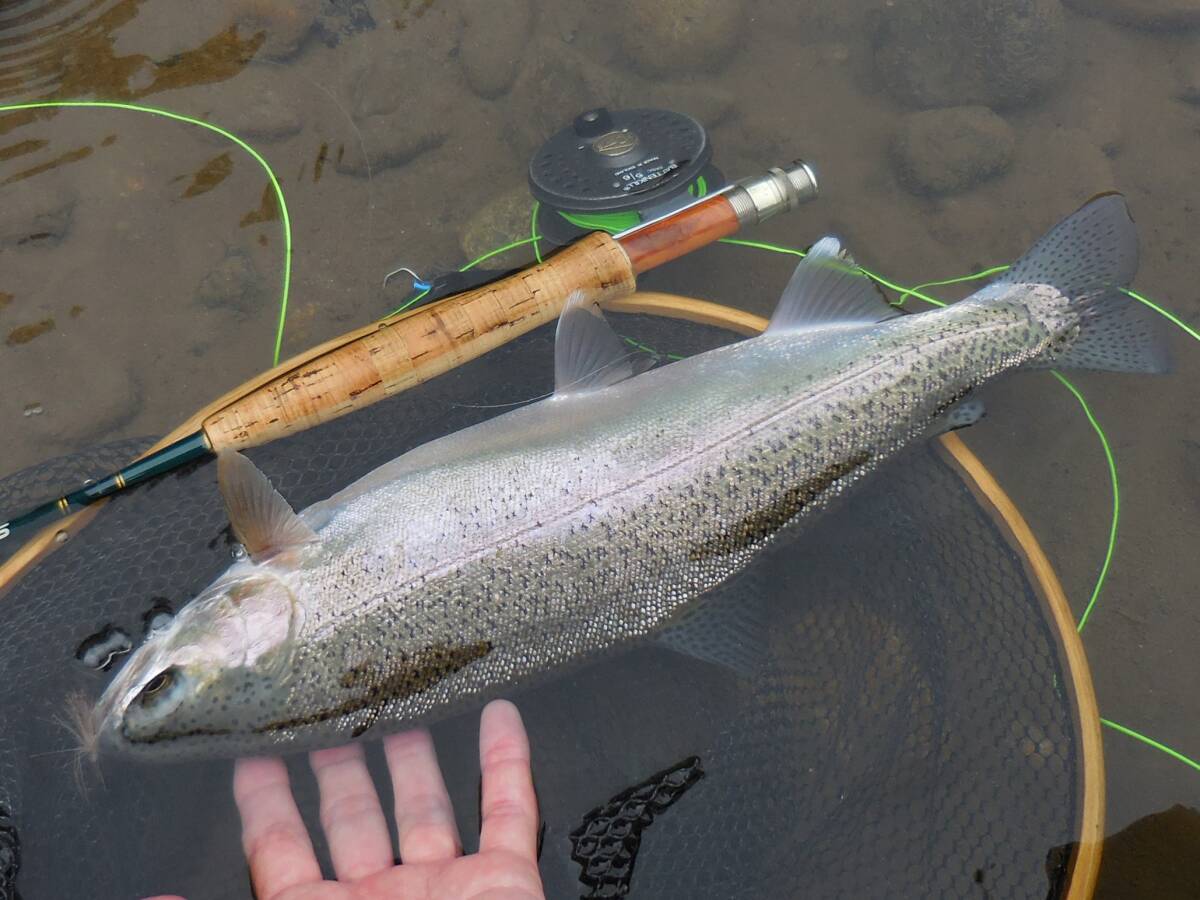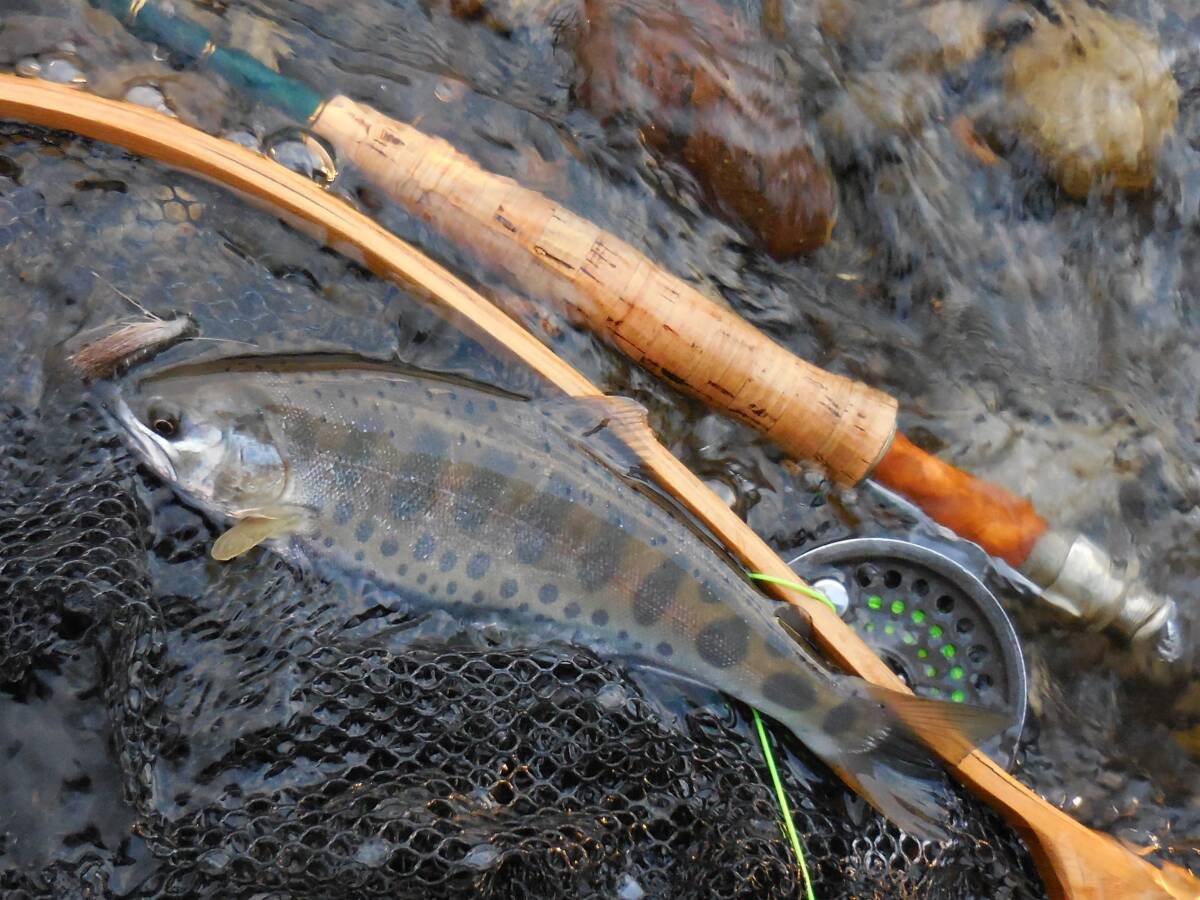 まず最初にライズした40cmクラスのニジマスが掛かります。その後、25~35cmクラスのニジマスやヤマメがコンスタントに掛かり、流心奥の対岸際で大きいのがライズしました。上手くフライを流すと掛かったのは49cmのニジマスです。夕方には草回りの浅瀬から同サイズが掛かりましたが、最初のダッシュでバレてしまいました。白っぽい蛾とヒゲナガがわずかに飛び交う中、とても反応が良かったです。