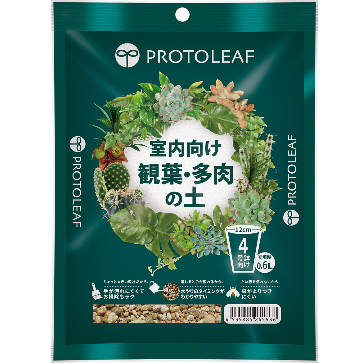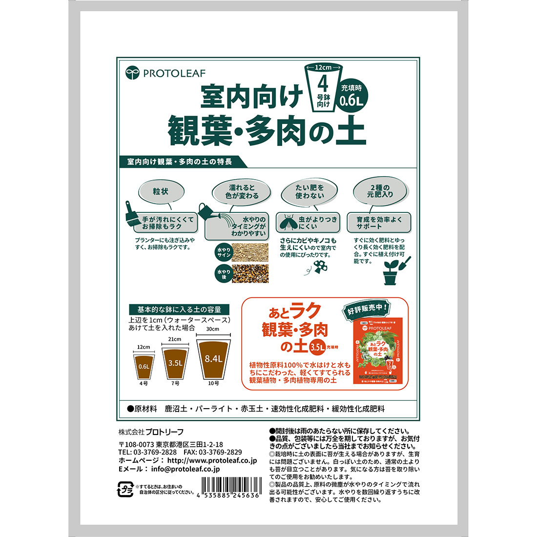 | 商品名 | プロトリーフ 室内向け観葉・多肉の土 4号鉢用 0.6L 園芸用土 植え替え 鹿沼 赤玉 パーライト 肥料入り |