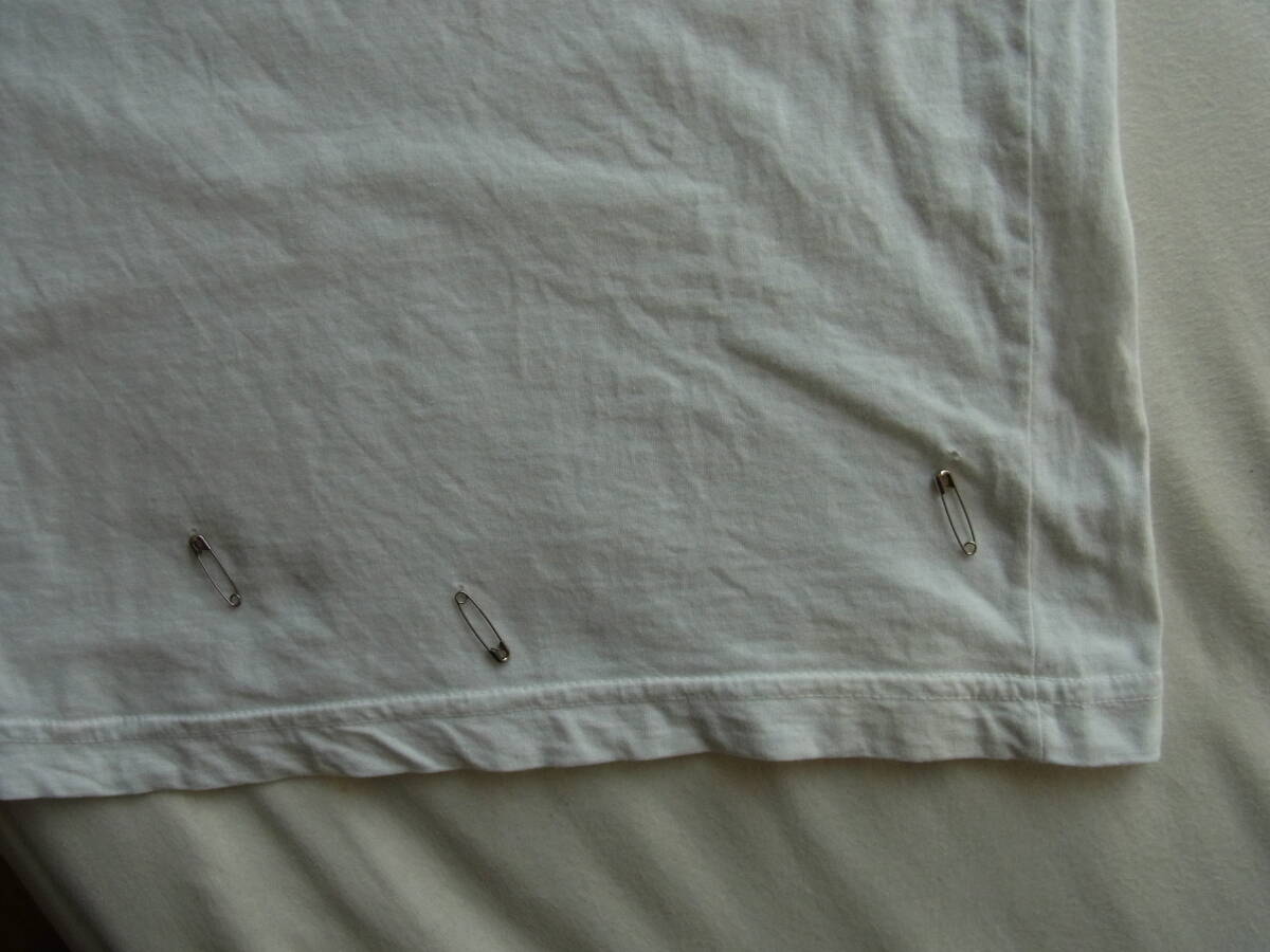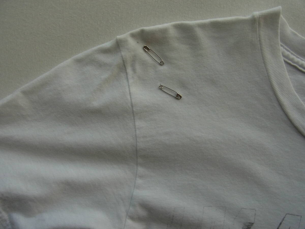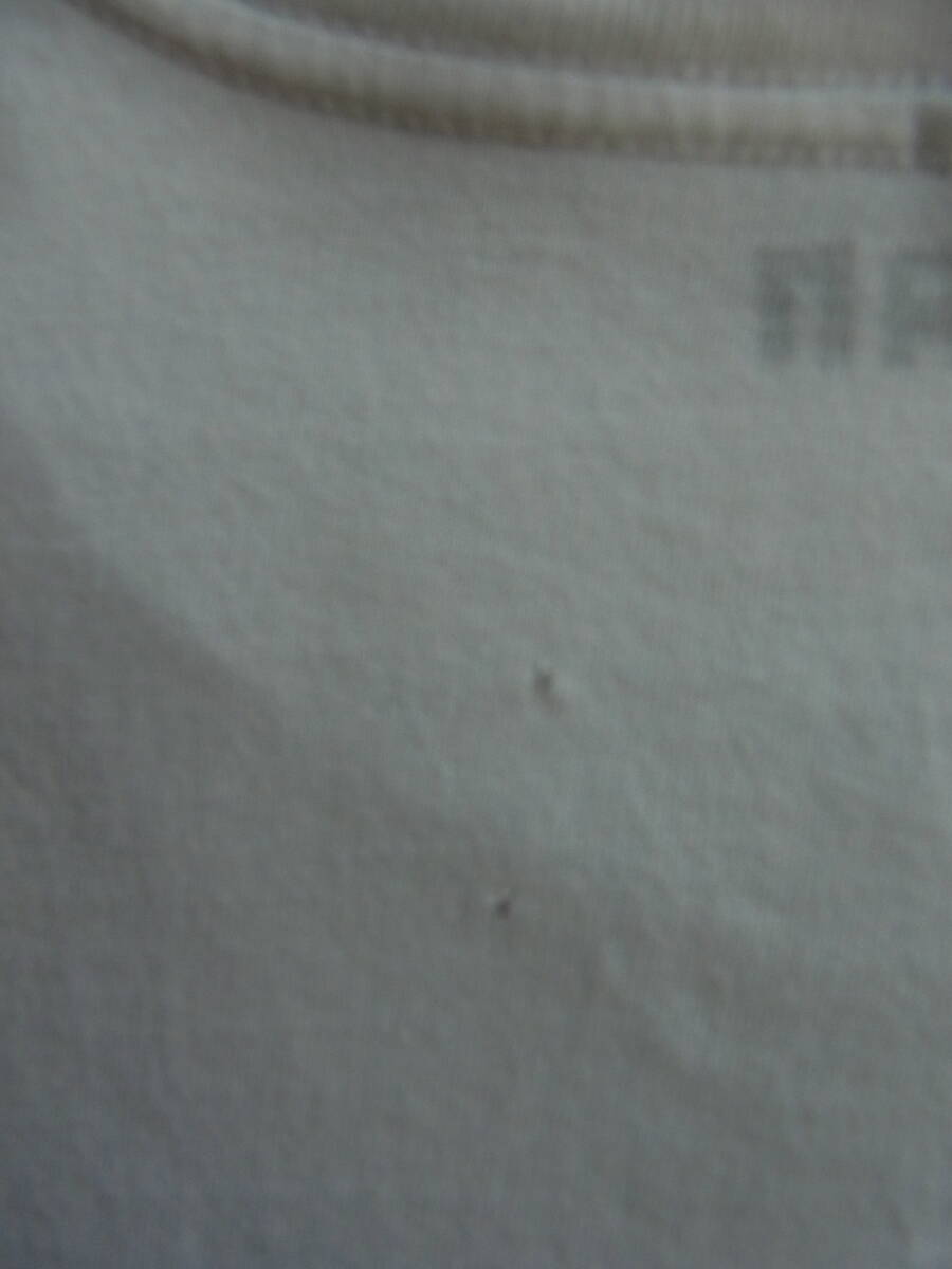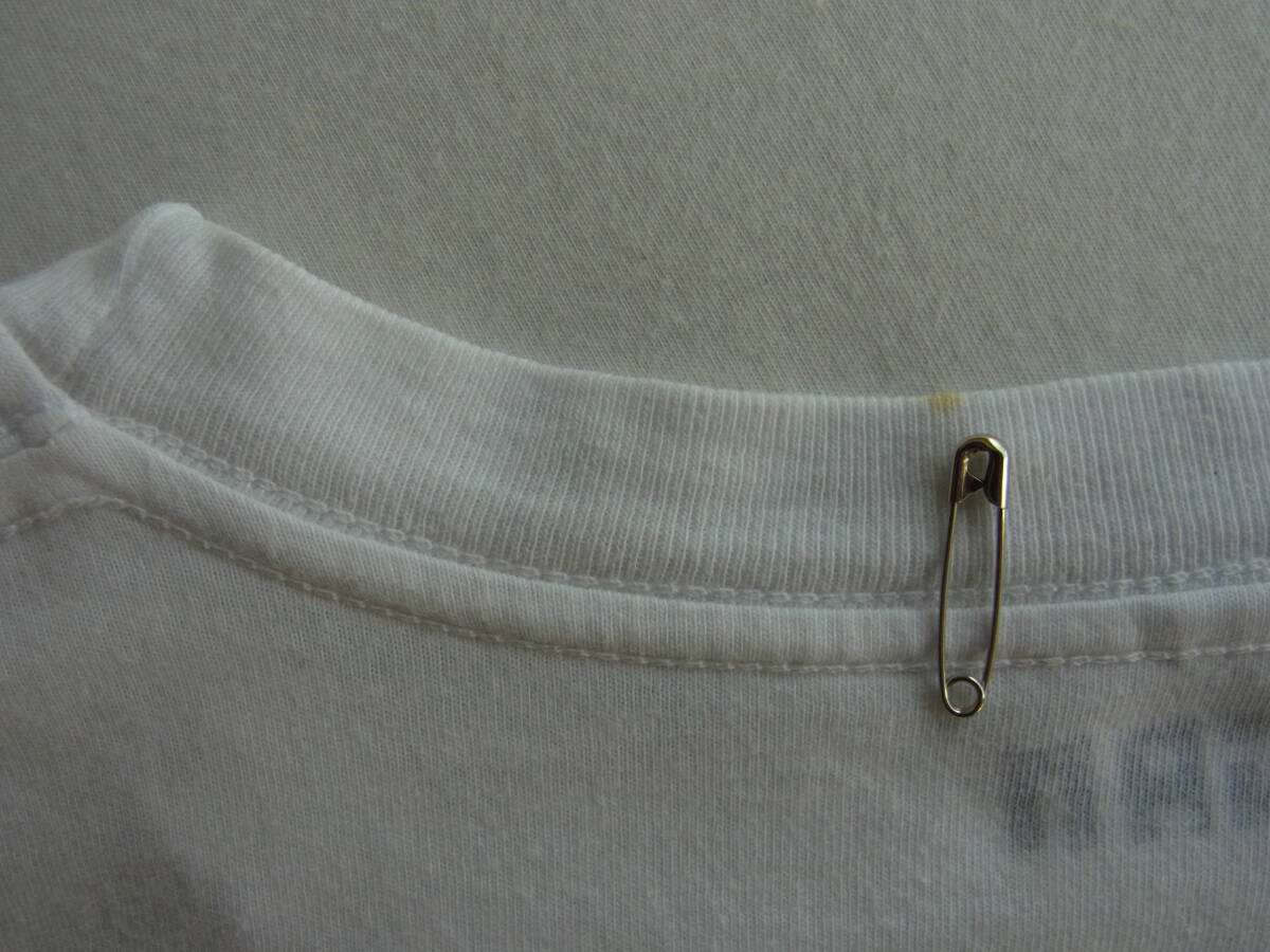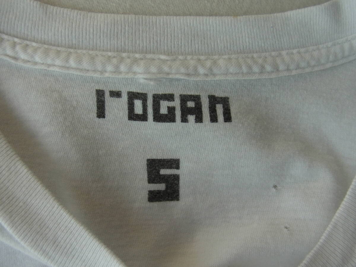ローガンのユーズド、ダメージ加工のプリントTシャツになります。USEDで着用感と、フロント左側に薄く汚れ、衿リブ9枚目の画像の様な小さなシミ、ダメージ加工による小さな穴が画像の安全ピンの箇所に御座います。