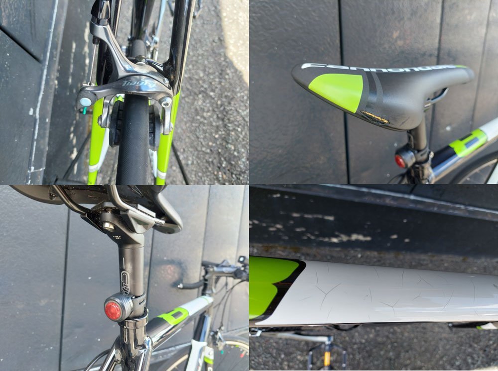 シートに擦れによる切れ見えます。トップチューブ上部塗装に経年劣化のクラック見えます。