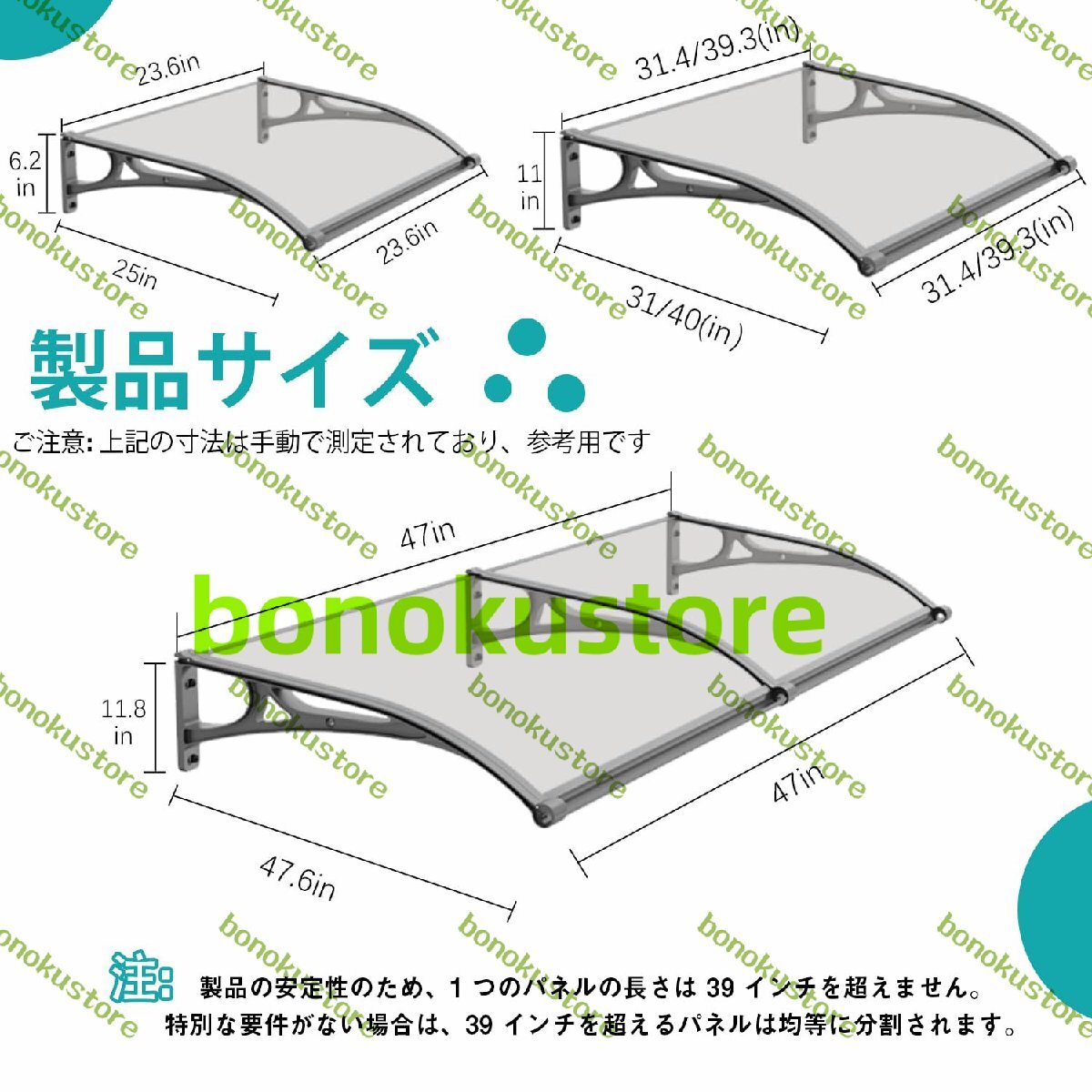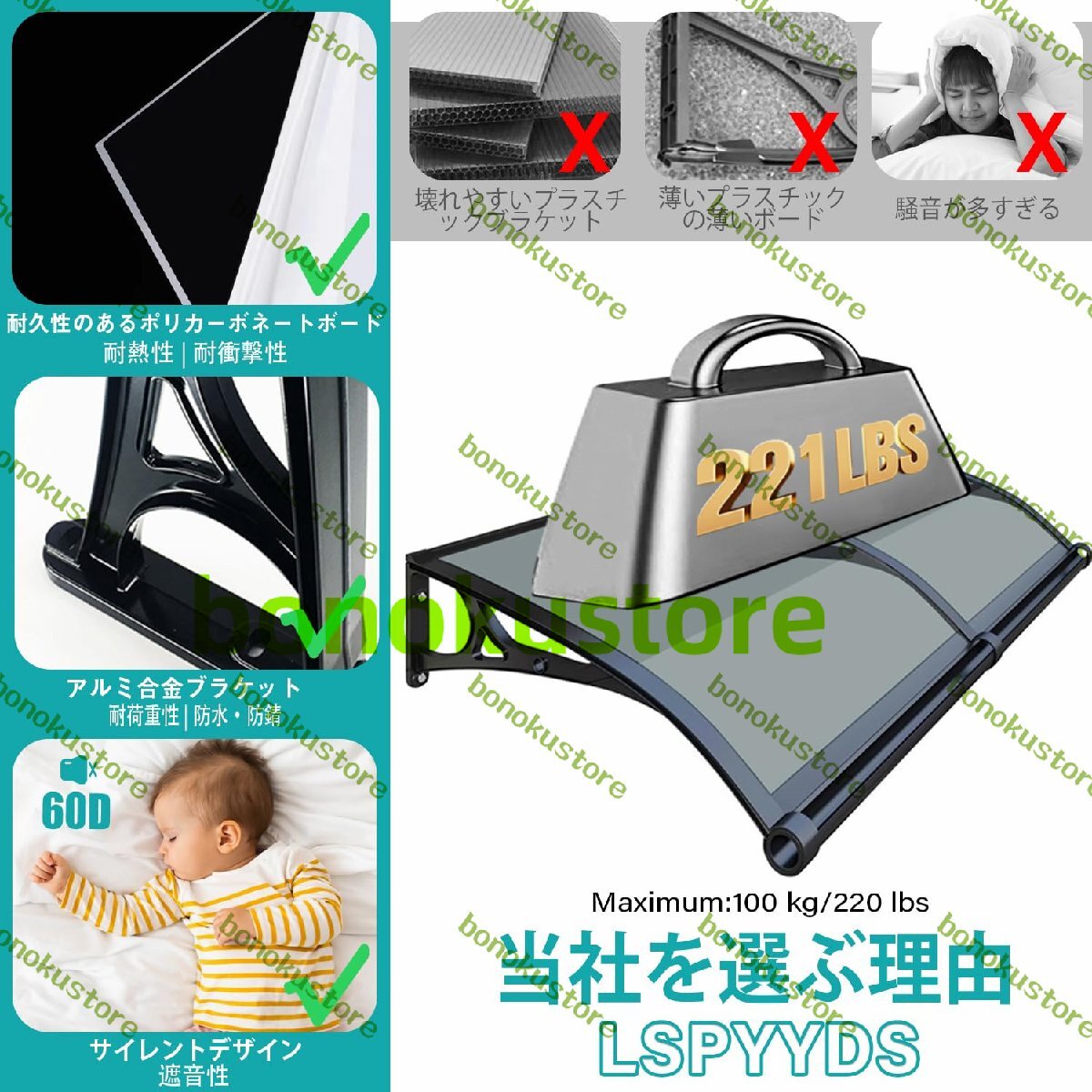 【耐久性のある素材】玄関用窓用オーニングは、壊れない高品質のポリカーボネートパネルとアルミニウム合金ブラケットで作られています。この設計により、ドアオーニングは最大100kg/221ポンドの重量に耐えることができ、-40°Cから120°Cの温度に耐えて変形せず、時間の経過とともに変色したり、割れたり、脆くなったりしません。パネルの耐衝撃性はガラスの250?300倍で、パティオ用のオーニングは長持ちするように作られています