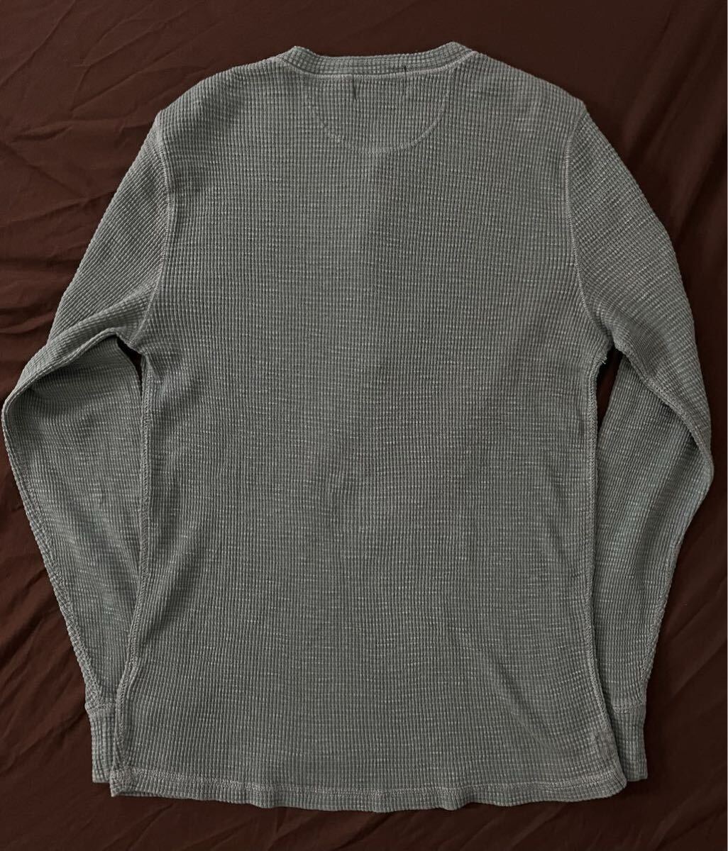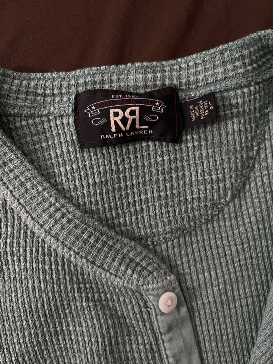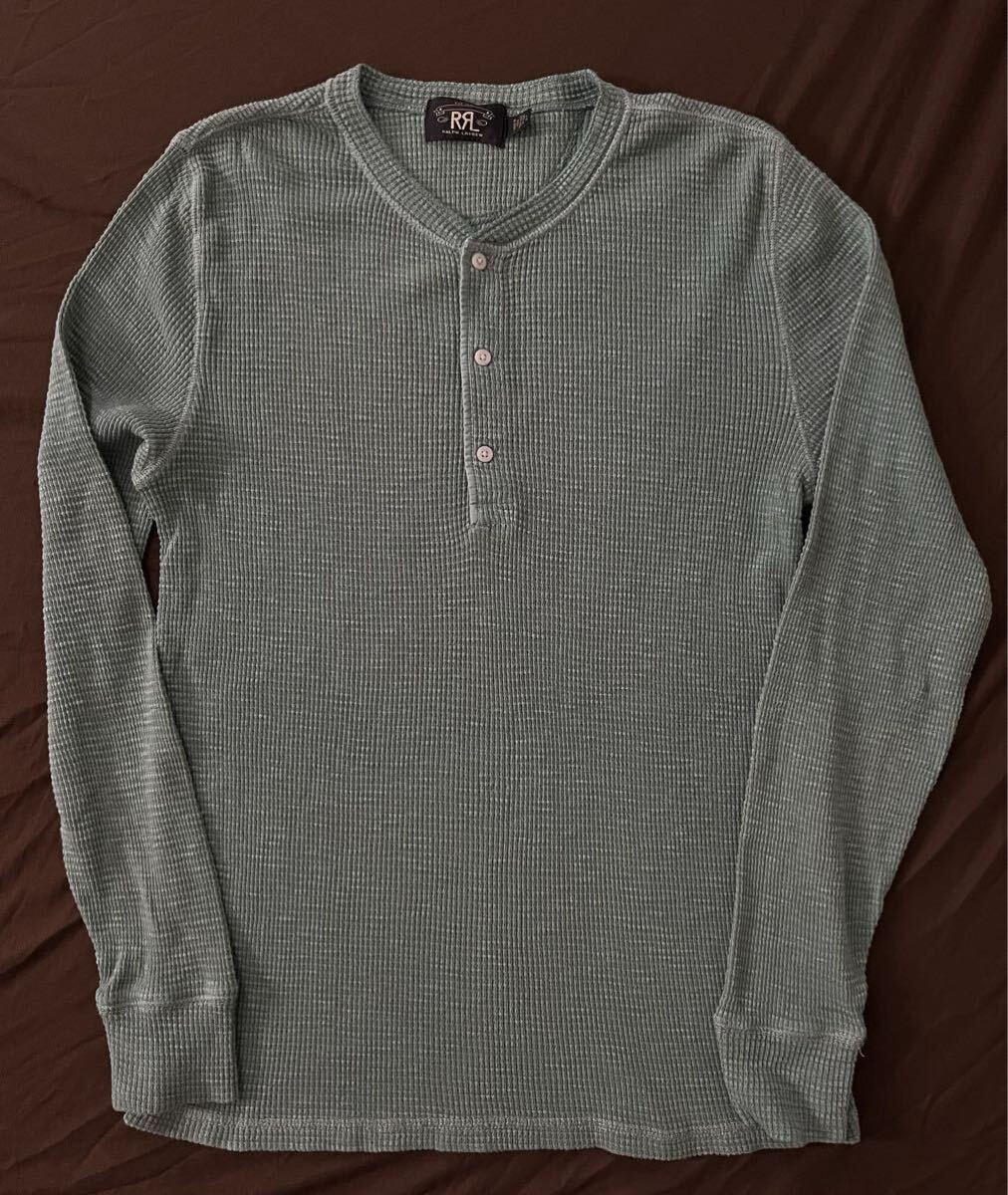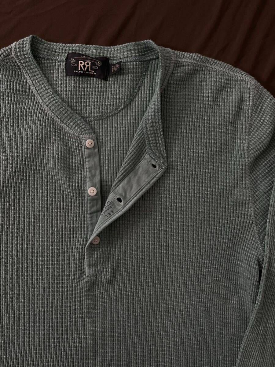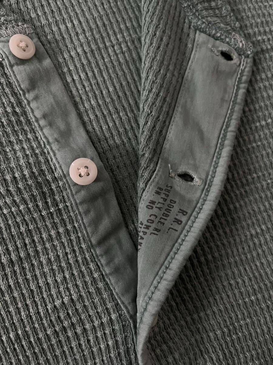 RRL特有の立体感のある生地ワッフルサーマル地をネイティブテイスト香るターコイズカラー染め上げたこれぞRRLな名作ヘンリーネック。