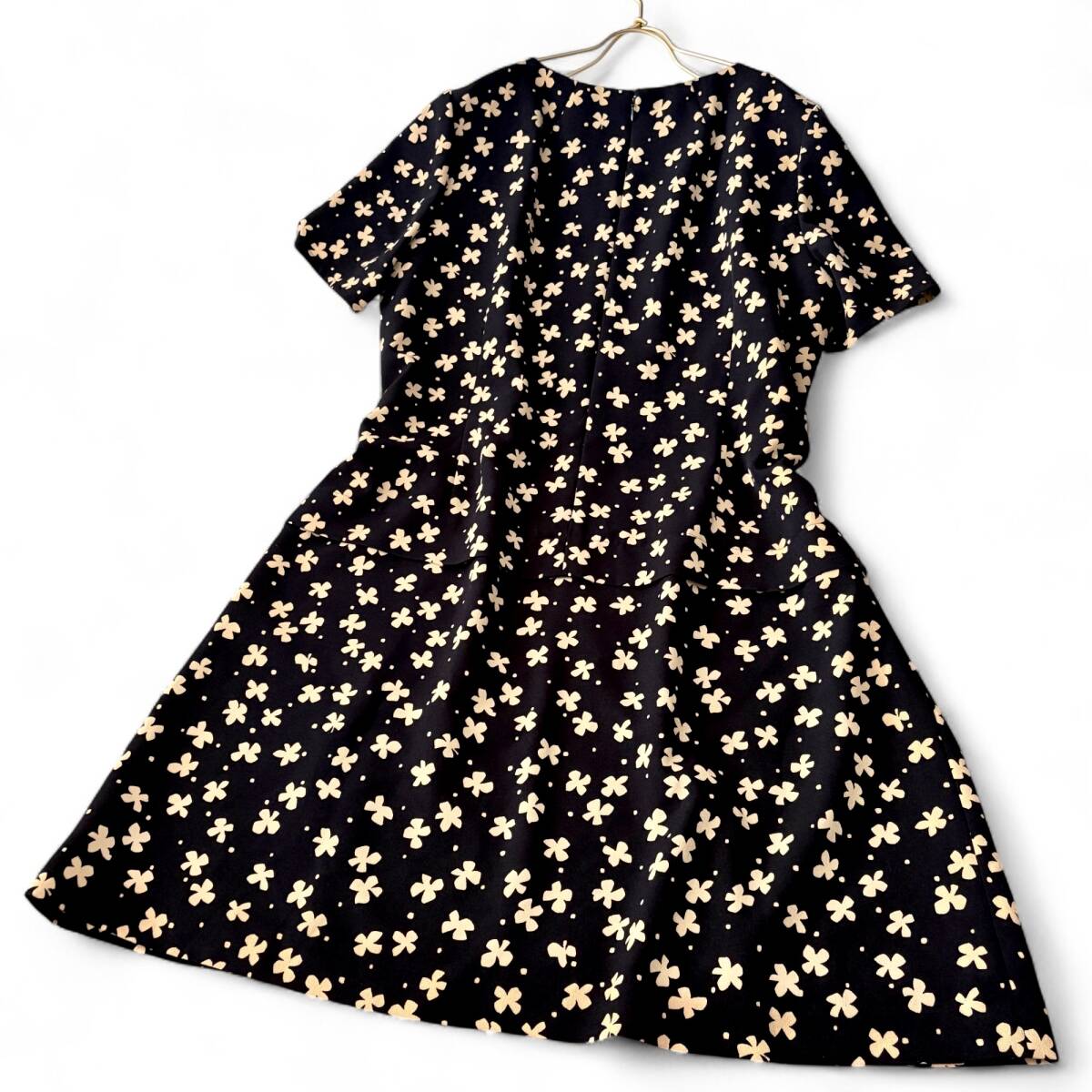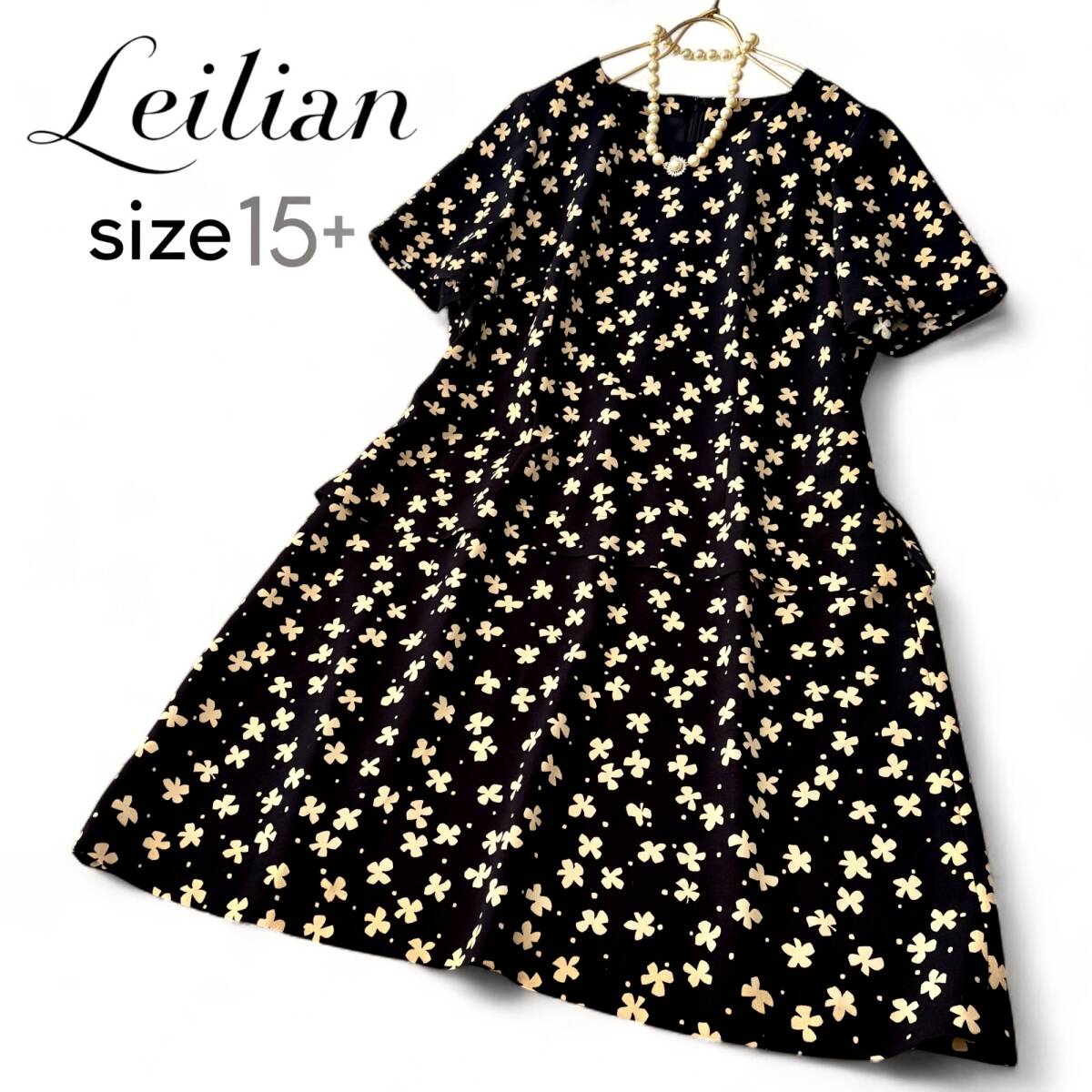 極美品 08C02 15プラス《レリアン Leilian プラスハウス》上品なフラワーモチーフプリント とろみ&落ち感 花柄 フレア ワンピース 半袖