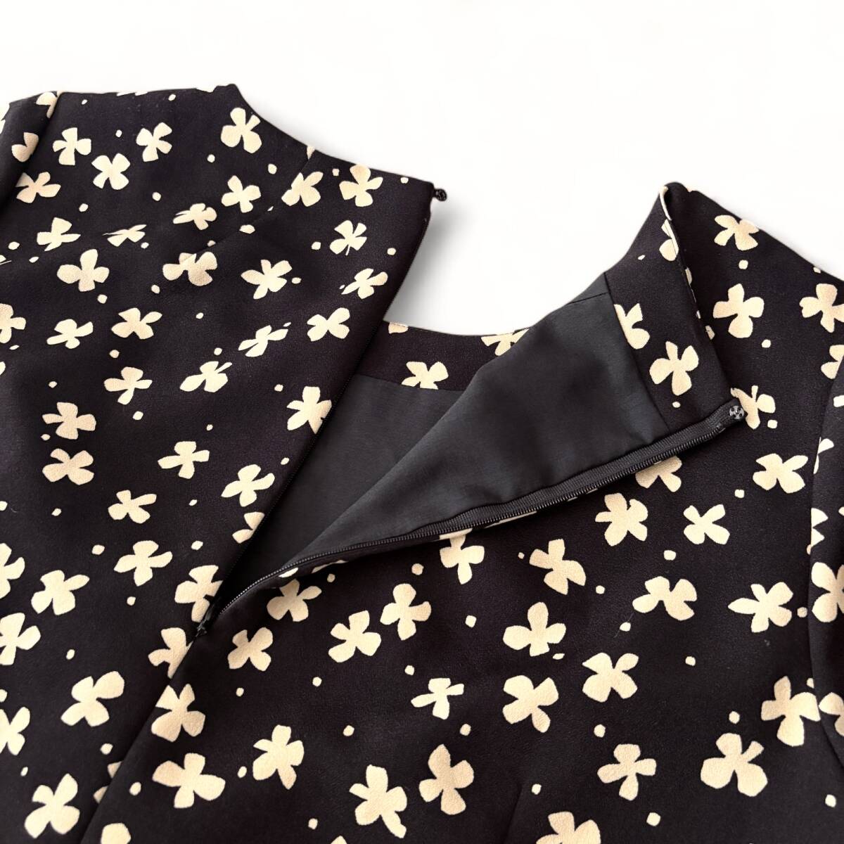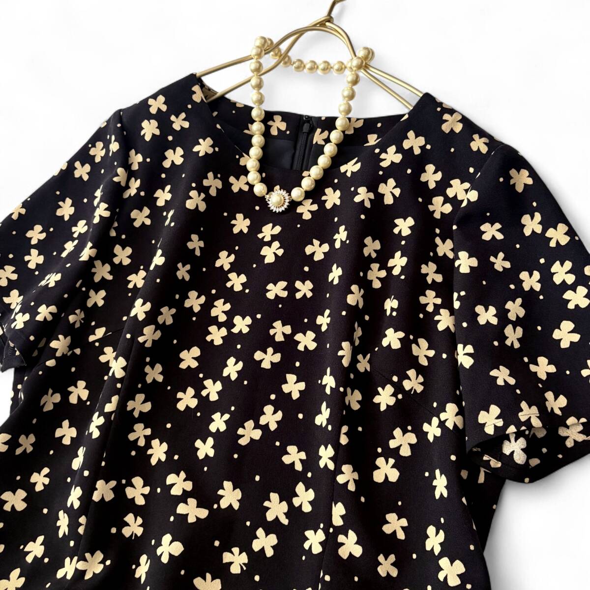 こちらのワンピースは、深みのあるブラック地に、花びらのようなブラウン系モチーフを散りばめた愛らしくも大人っぽいデザイン。とろみのあるポリエステル素材が美しい落ち感を生み、着るだけでシルエットに優雅な動きをプラスします。