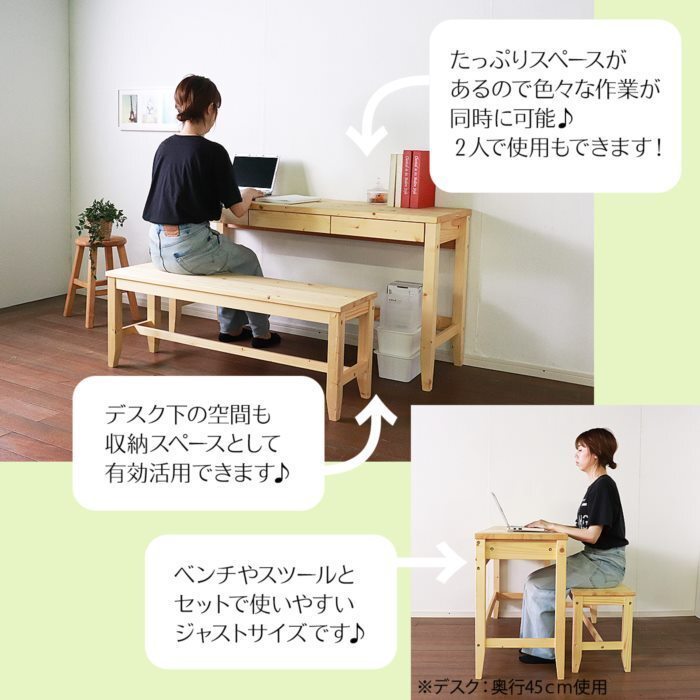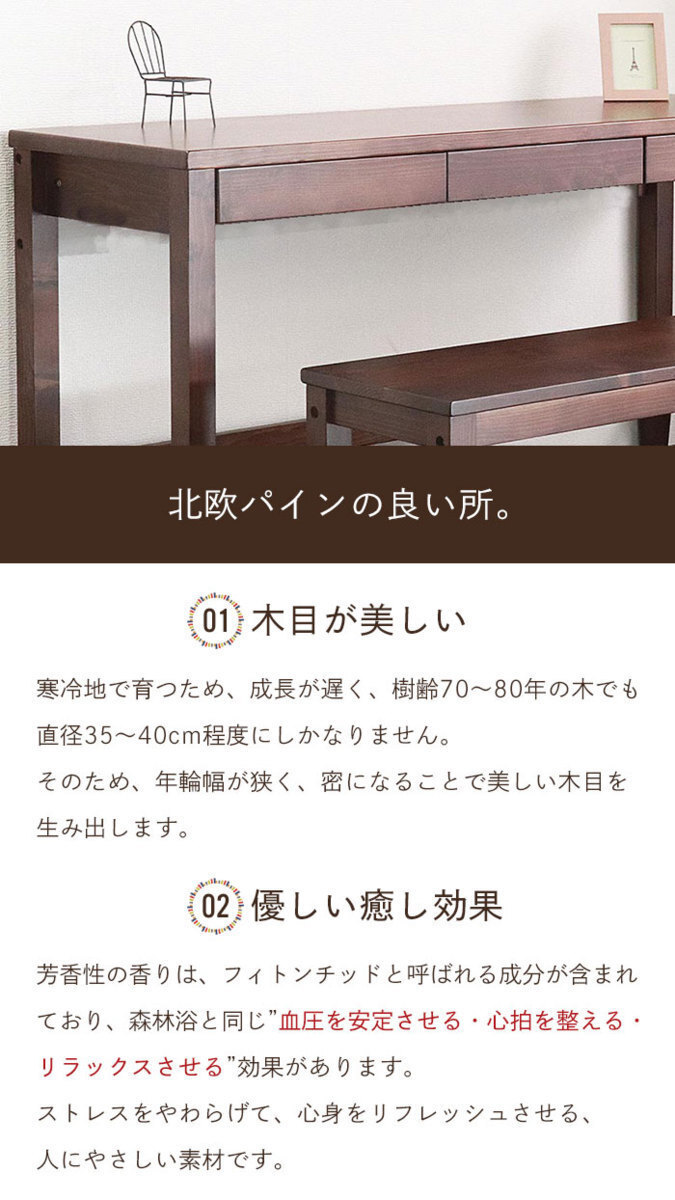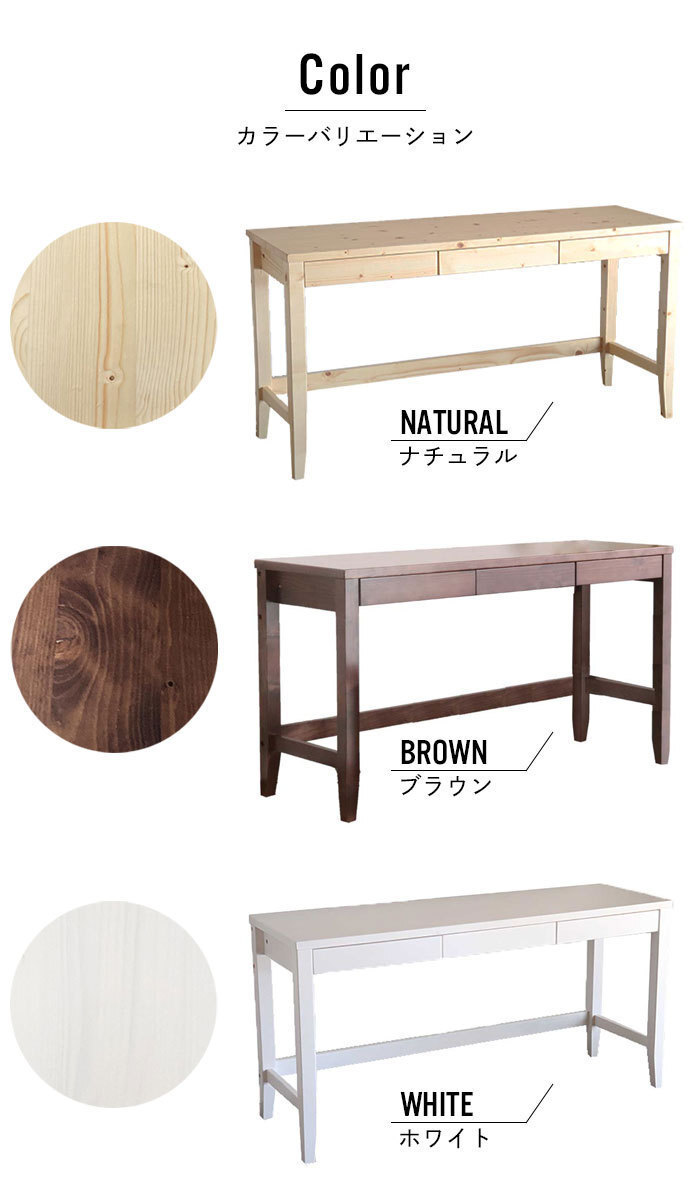 | 商品説明 | 北欧パイン仕様のシンプルな、引き出し3杯付き木製リビングデスクです。 北欧パイン材の美しい木目と、天然木ならではの落ち着いた色味をお楽しみください。 脚先が細くなっているおしゃれな作りで、シンプルながらスタイリッシュなデザインです。 ワイドな3杯の引出しはA4ファイルがゆったり入るサイズなのでデスク上をすっきりと整理できます。 幅140cmとスペースがたっぷりあるので、色々な作業を同時にしたり、2人で使用したりすることもできます。 デスクライトなどが取り付けやすい仕様がうれしいポイントです。 脚裏に付属のフェルトを付けることで床を傷つけにくくします。 【仕様】 ■製品サイズ:約幅140×奥行45×高さ73cm ■材料:パイン材 塗装:水性塗料 ■カラー:ブラウン、ナチュラル、ホワイト ■キーワード:机 モダン 木製 北欧パイン 無垢 デスク 幅140 高さ73 スリム 書斎 作業机 シンプル ナチュラル おしゃれ 薄型 奥行45cmデスク 机 作業台 作業机 ワイドデスク 引出付き 薄型 北欧パイン 趣味 勉強 在宅ワーク ワイド 木 ウッド 木目 天然木 リビング ダイニング 家族 子供 学生 主婦 家具 木製 ファニチャー ブラウン ホワイト |