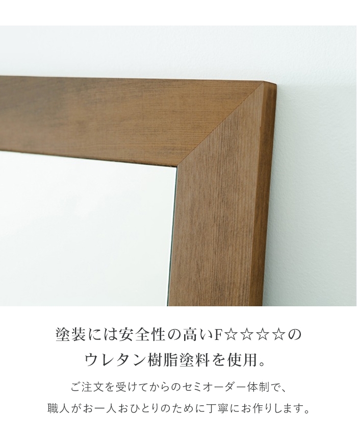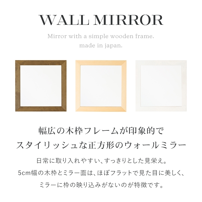 | 幅広の木枠フレームが印象的でスタイリッシュなスクエアタイプ。 無垢材にこだわり木枠にはツガ材を使用。 5cm幅の木枠とミラー面は、ほぼフラットで見た目に美しく、ミラーに枠の映り込みがほとんどないのが特徴です。 |