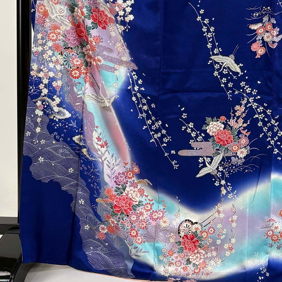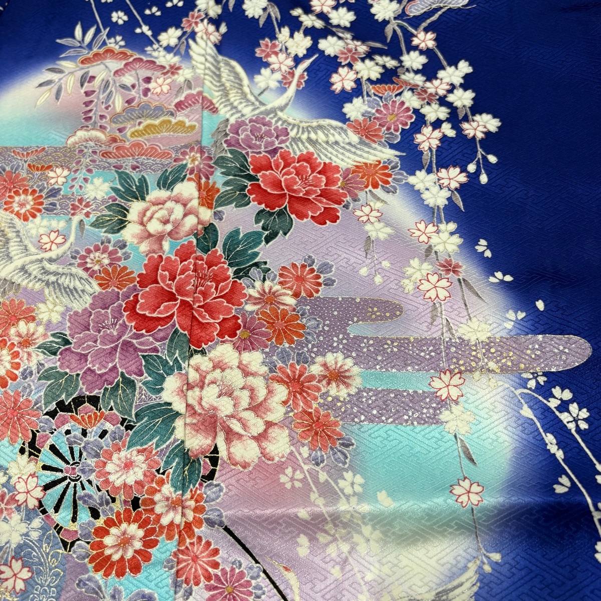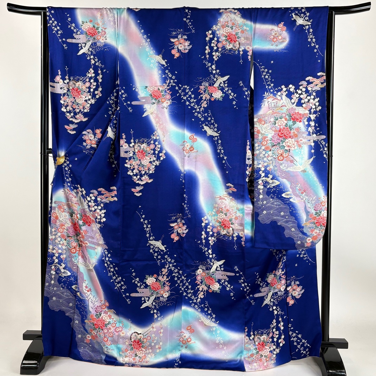 振袖 秀品 鶴 花車 金銀彩 ぼかし 紺色 袷 身丈169 裄丈65 M 正絹 【中古】 |