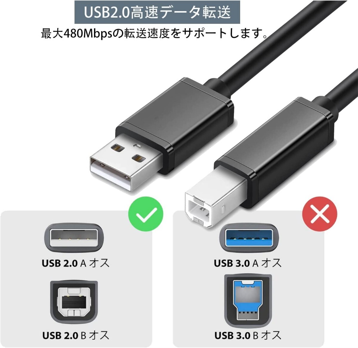 【信号純度を向上】:高周波ノイズを吸収する効果があるフェライトコアが付いたプリンターコードです。普通の同類ケーブルより高いパフォーマンスを実現します。USB 2.0の480Mbpsの転送速度により、転送速度が重要となる機器の接続において、USB 2.0が広く使用されています。