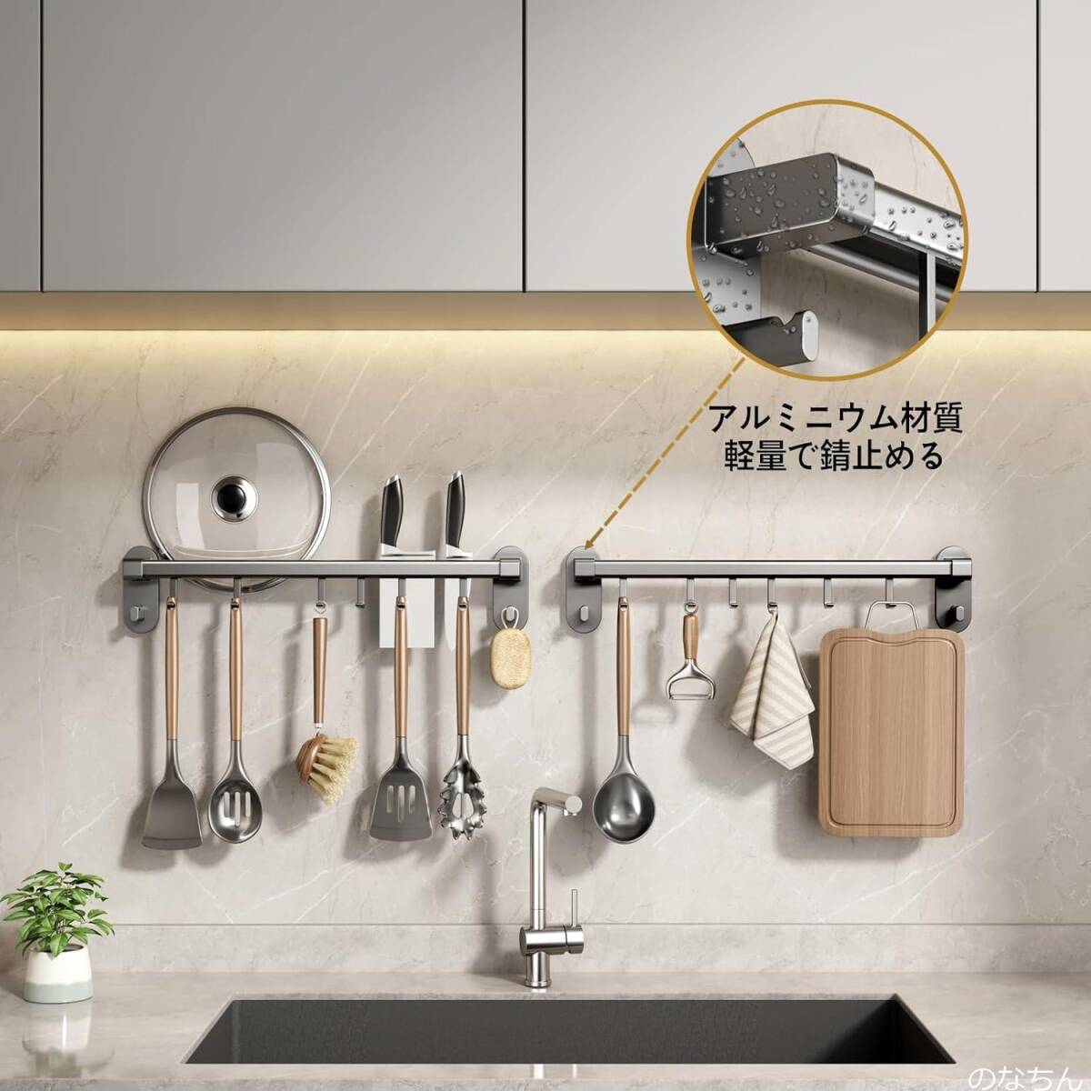 キッチンツールフック アルミニウム キッチンラック 強力粘着 台所ラック グレイ 台所 収納 軽量 キッチンツール 収納 防水防錆