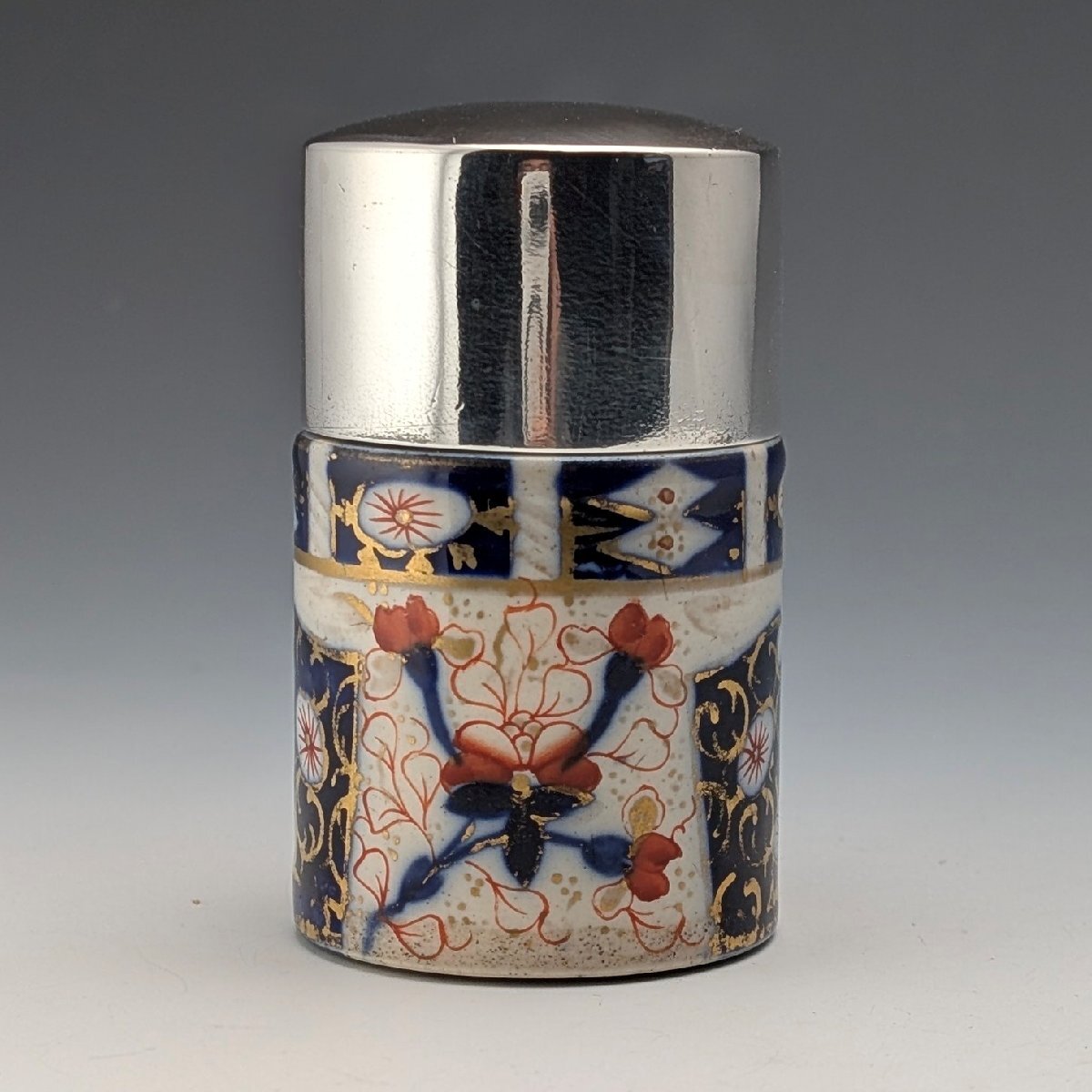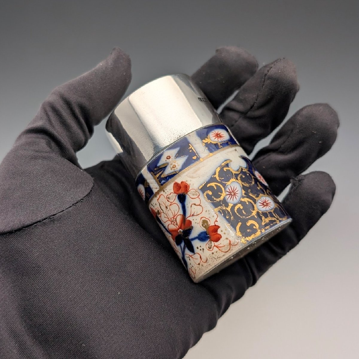 古伊万里風に絵付けされた陶器製のボトルに純銀製の蓋が組み合わされています。