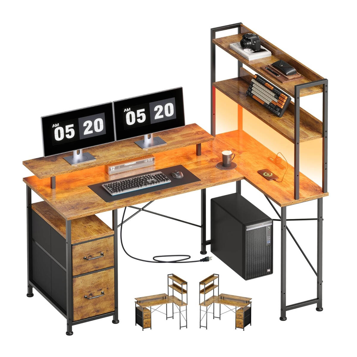 L字デスク ピンテージ2 幅120x奥行80cm LEDライト付き PCデスク パソコン机 コンパクト 学習机 引き出し付き 上収納棚付き