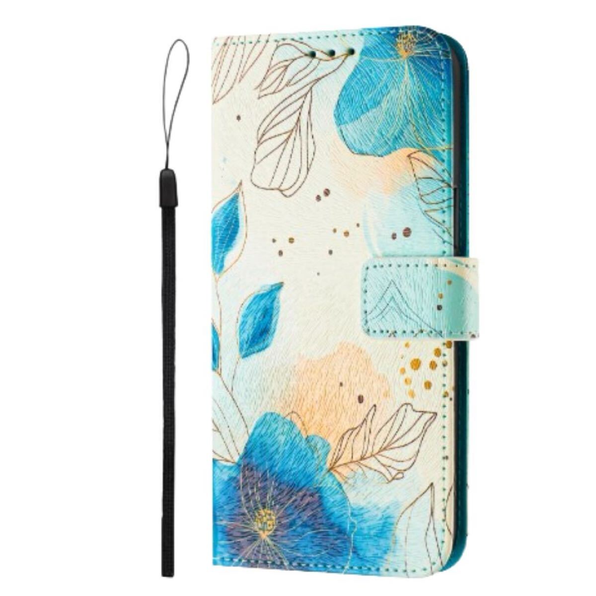 このスマホケースは、やさしい青の花ときらりと光るゴールドがアクセントの手帳型ケースです。