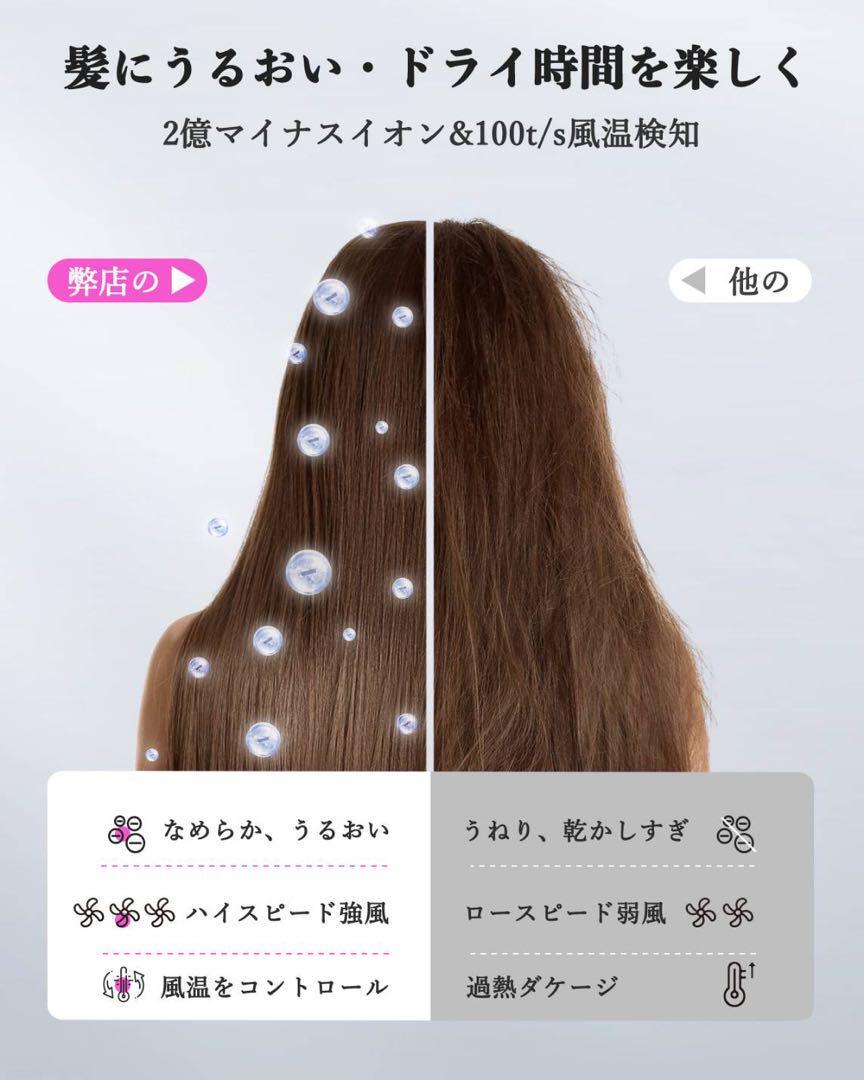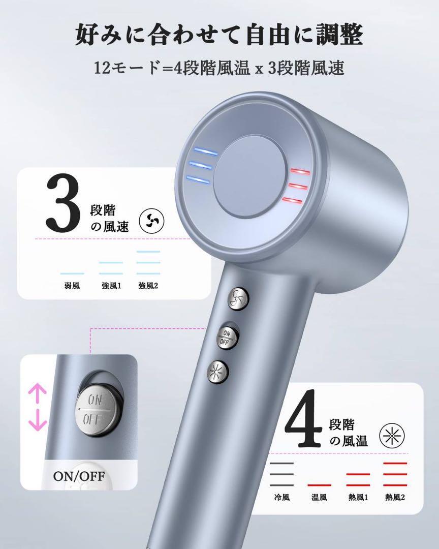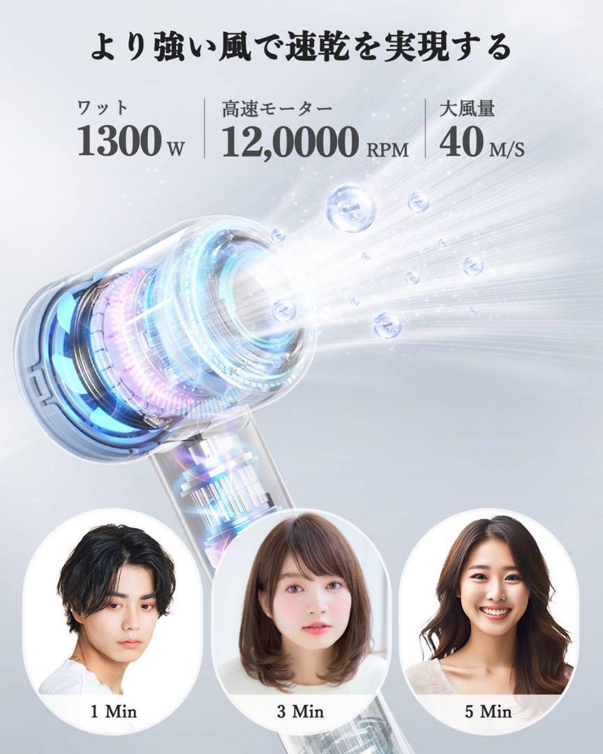 高速モーターが内蔵され、Bopwavyドライヤーは、毎分120,000の高速回転を生成、大風量で40m/sのパワフルな風を送ります。濡れた髪は乾いた髪より弱いため、髪のダメージを防ぐためにすばやく乾かすことが重要です。弊店のドライヤーは速乾により、髪に熱を当てる時間が短くなります。