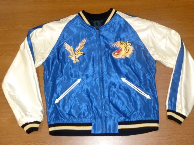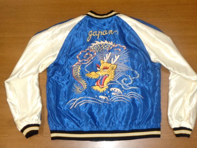 〇スーベニアジャケットのなかで最もスタンダードな両面にアセテート生地を使ったリバーシブルタイプ。戦後当時のスカジャンには、シルクに似た高級感を持つ物資統制外品目のアセテートが使われていた。中綿がないため季節を問わず着用でき、独特なドレープ感も魅力といえる。