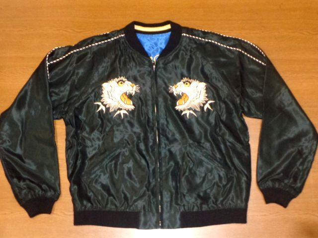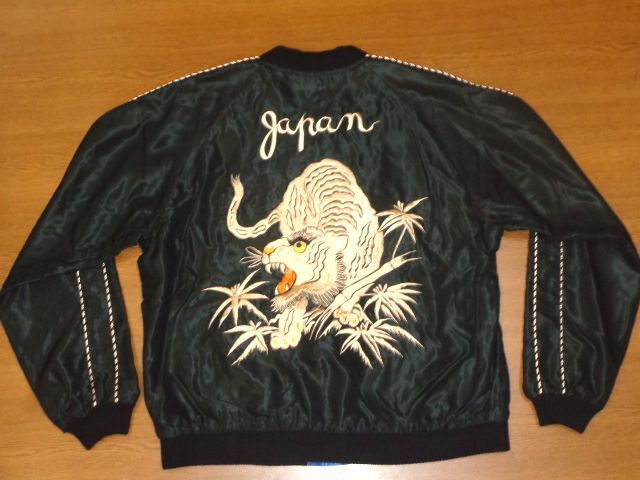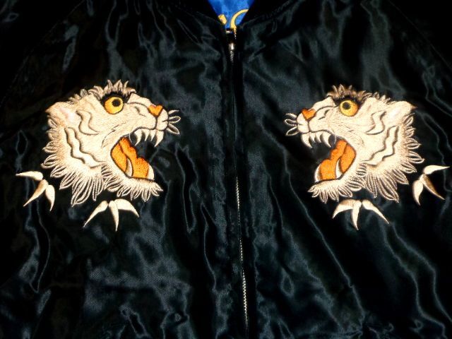 〇表面はヴィンテージの虎柄の中でも珍しい、斜め上からのアングルで白虎を描いた1950年代中期の絵柄。針足を駆使しつつ、虎斑の縞模様を刺繍で埋めずに生地のブラックを部分的に見せることで輪郭を強調し、立体的に表現している。黒一色のボディに漆黒のリブ、黒白のパイピングなどモノトーンを基調としたボディに白虎が映えるシックな仕上がり。