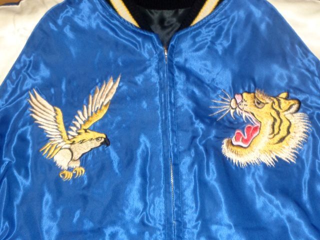 〇リバーシブル面は波飛沫とともに水辺から姿を現す金龍の絵柄。晴天を想わせるブルーのボディをベースに、長い体躯を雲間に隠しながら迫り来るダイナミックな構図が特徴で、龍の顔にのみ黒いアウトラインを入れることで遠近感と迫力を強調している。胸には鷲と虎が描かれており、スカジャンの三大モチーフである鷲・虎・龍が揃った贅沢な一着。