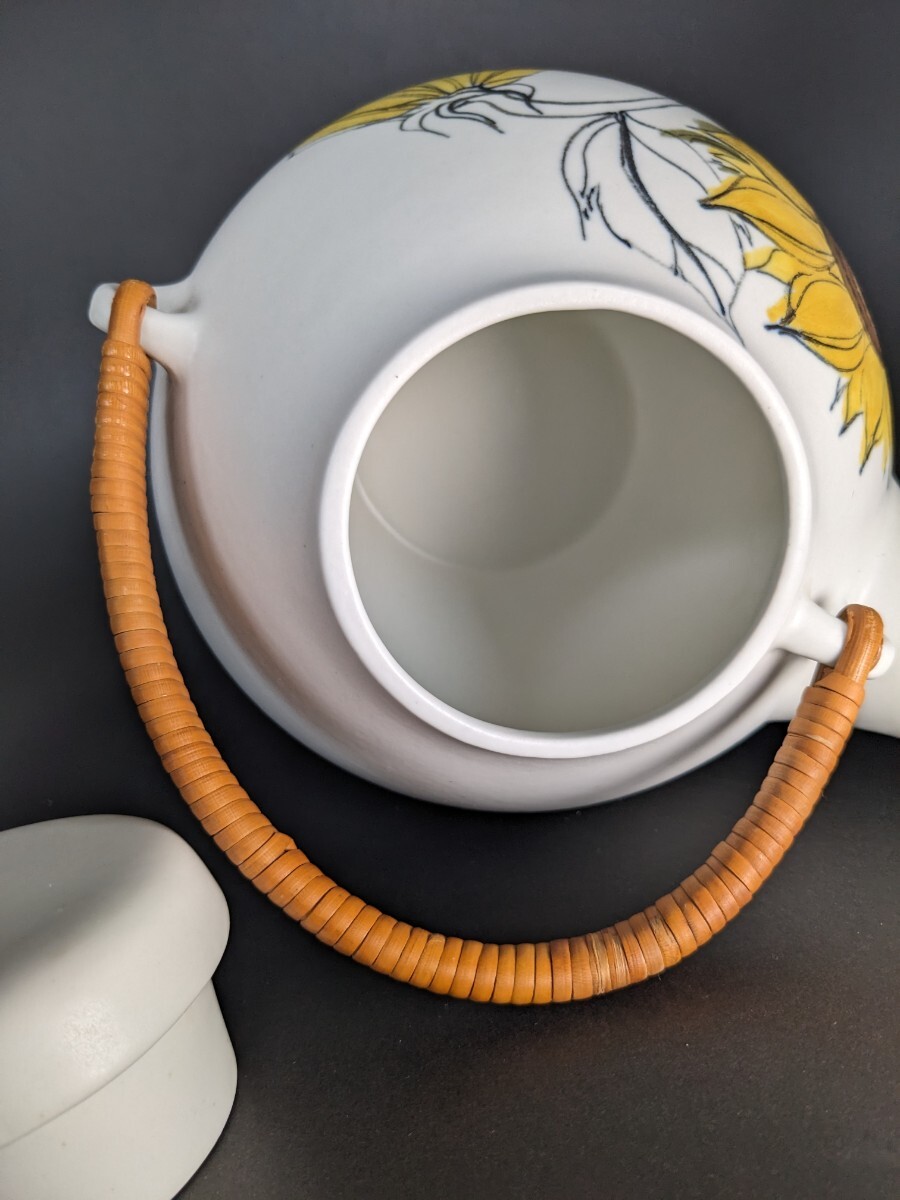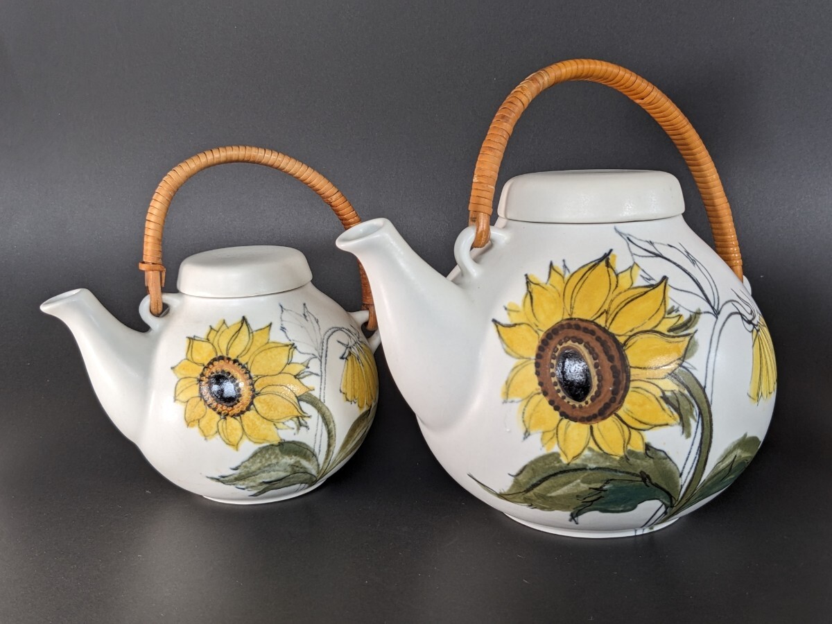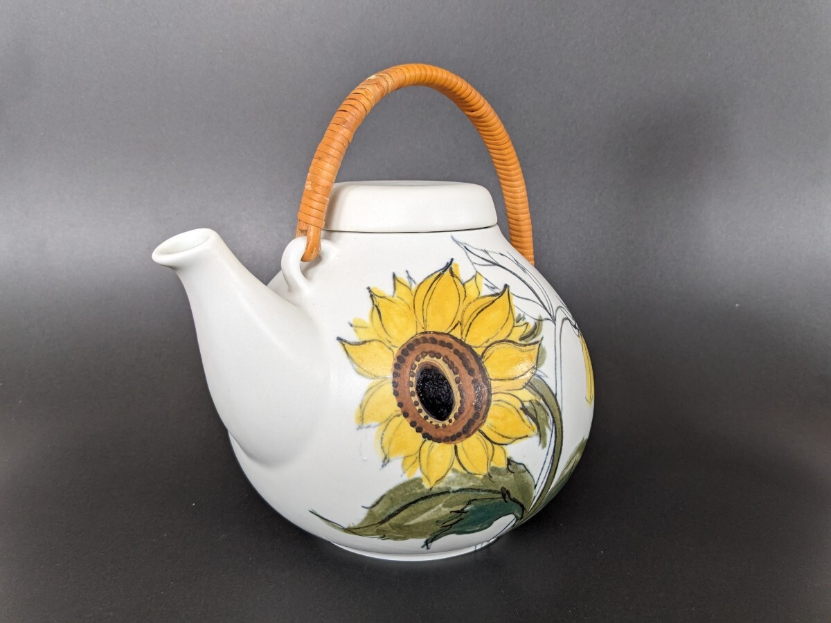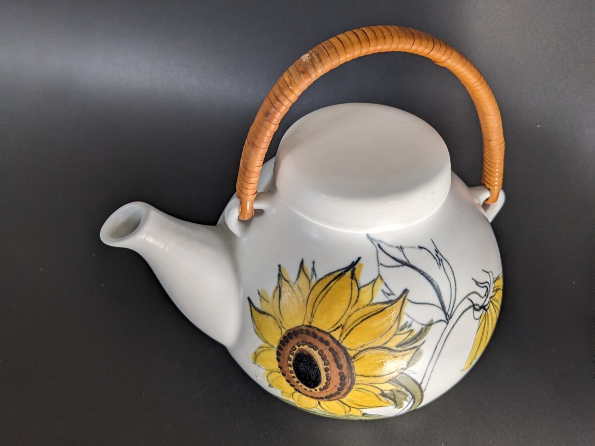 本体のマットな質感や藤のハンドルなど、日本の陶器に共通するデザインで、共に片面ひまわりの手描きの絵柄です。