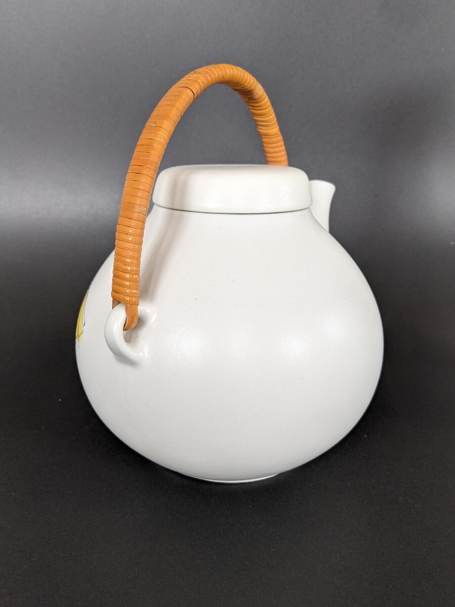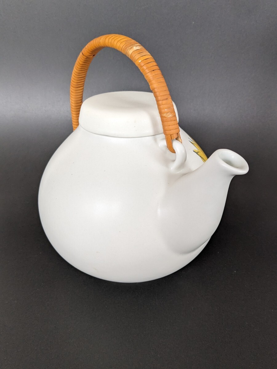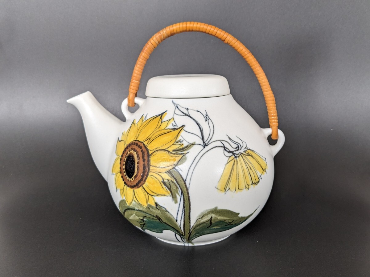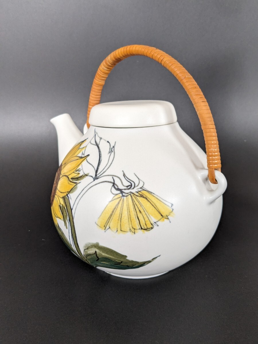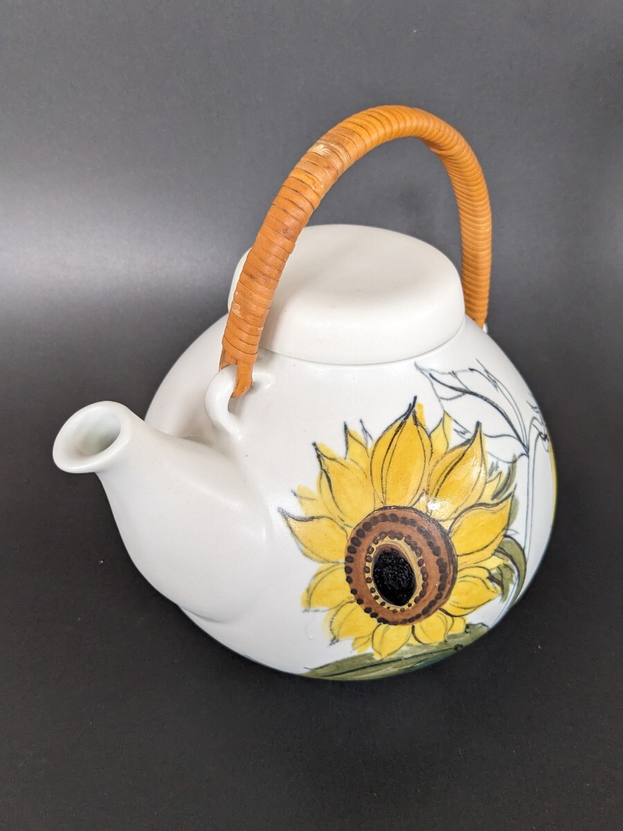 本体のマットな質感や藤のハンドルなど、日本の陶器に共通するデザインで、共に片面ひまわりの手描きの絵柄です。