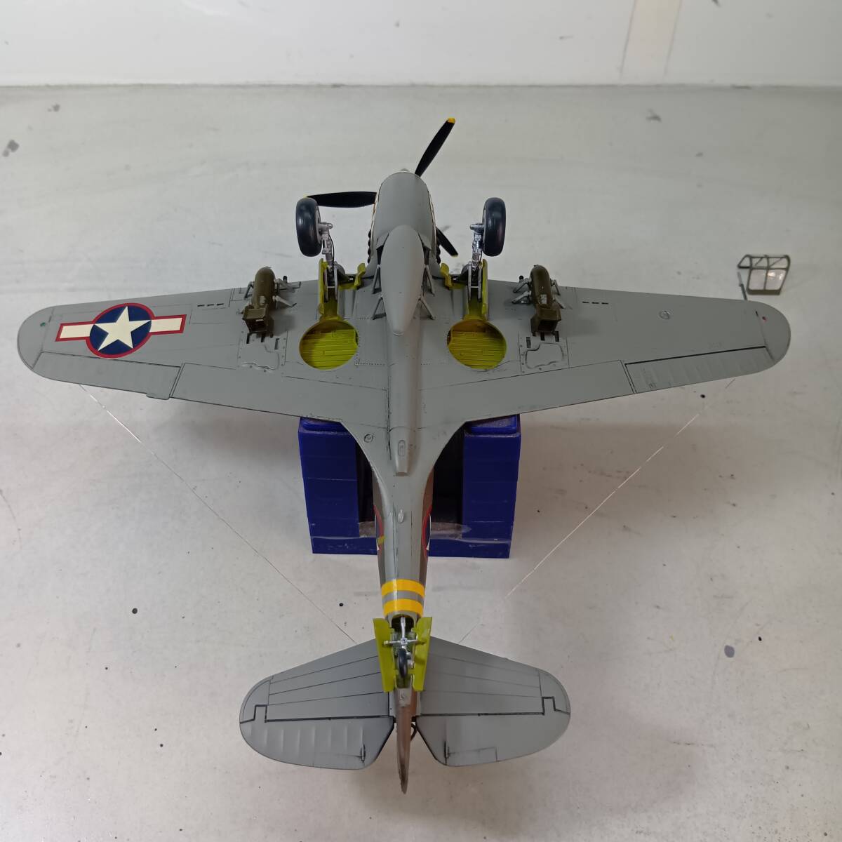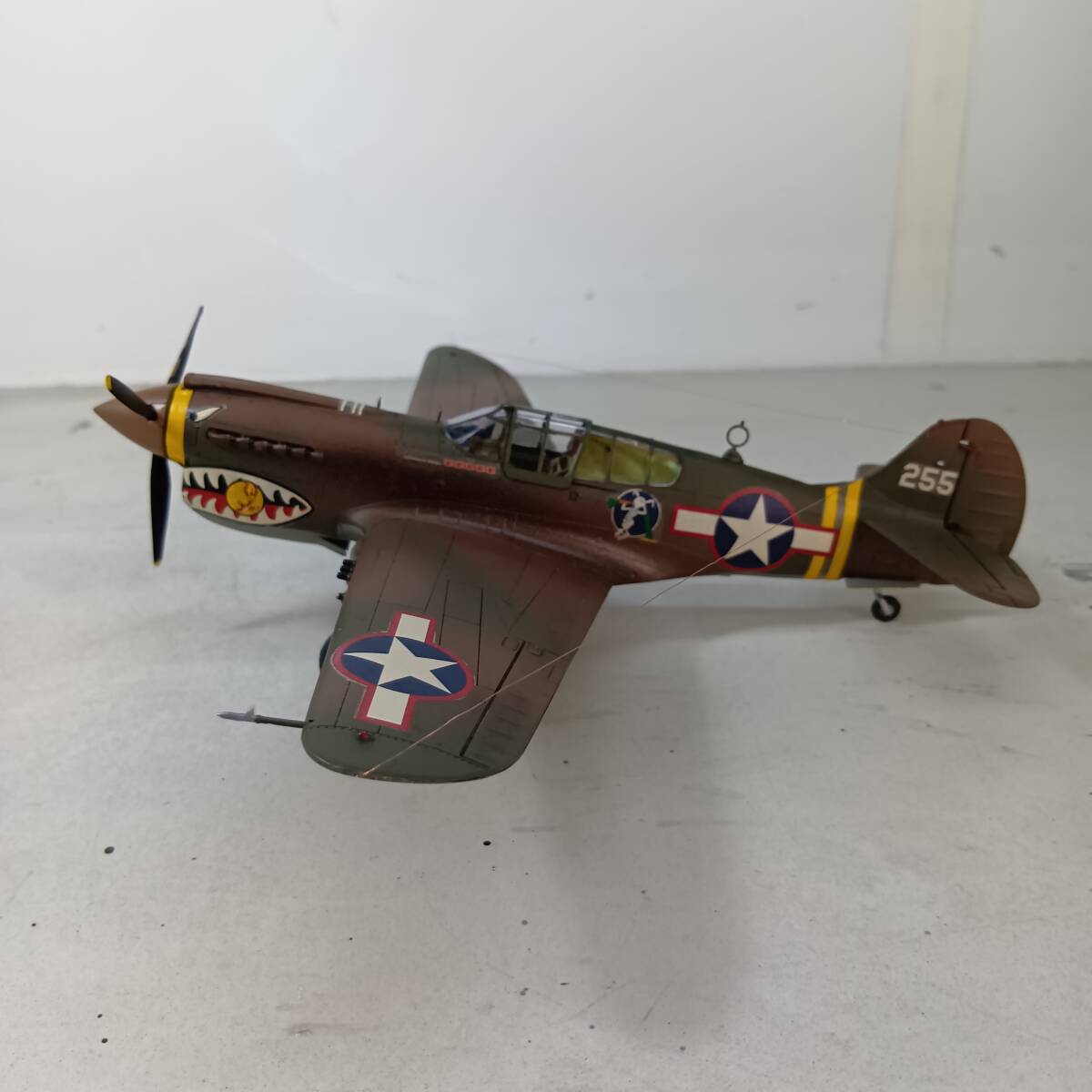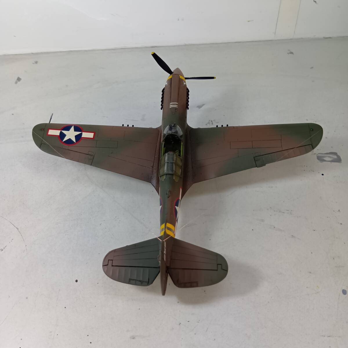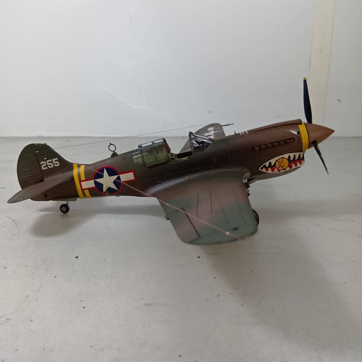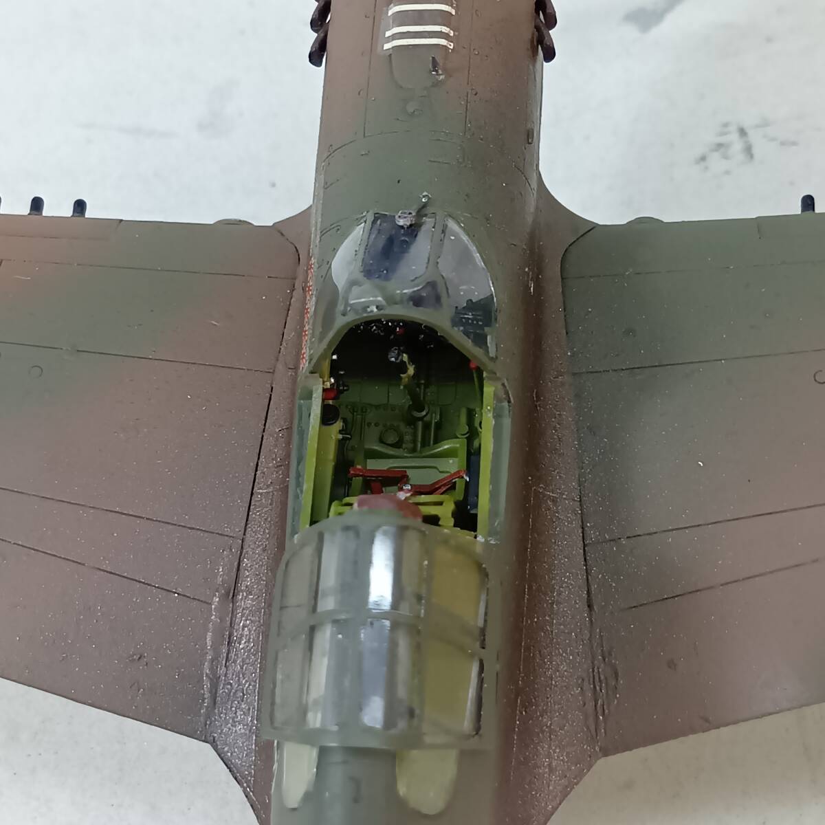 ①機体接着後、下塗りとして全面クレオスMr.カラーNo.8(銀)を機体全体にスプレー塗装し、接着跡、筋彫りの修正を行い、下面をクレオスMr.カラーNo.25(ダーク・シー・グレー)で、上面をクレオスMr.カラーNo.23(ダークグリーン)で吹き付け、さらに、上面にクレオスMr.カラーNo.22(ダークアース)を帯状に吹き付け、筆塗りで修正をした後、墨汁でスミ入れウォッシングをしました。 ②P-40は乗りやすく、故障が少ない稼働率の高い機体で、さらに、大戦初期~中期の連合軍の苦戦時に使用されたため、当時の写真を見ると汚れた機体が多く、排気管や機体の汚れなど、いつもより激しく汚しました。 ③操縦席は筆塗り塗装し、計器盤はドライブラシで再現し、シートベルトを紙製で追加工作しています。 ④第2風防は接着していませんので、外して内部を見ることができます。 ⑤主脚のブレーキパイプを追加しています。 ⑥国籍マーク、部隊マーク・機体番号等はデカールを使用しました。 ⑦0.12mmエナメル線でアンテナ線を再現しました。 ⑧武装は、付属の燃料タンクを胴体下に1個、タミヤ 1/48 P-51Bのアメリカ型250ポンド爆弾を翼下に計2個搭載しました。 ⑨マーキングは、第23戦闘グループと共に終始CBI戦線で戦った第10空軍第51戦闘グループ第26戦闘スコードロン__エドワード・M・ナルメイヤー少佐乗機_1943年12月_中国・昆明基地としました。 ⑩費用の関係からエッチングパーツ等、高価なものは一切使用していません。 発送サイズ たて×よこ×高さ 80サイズ |