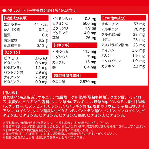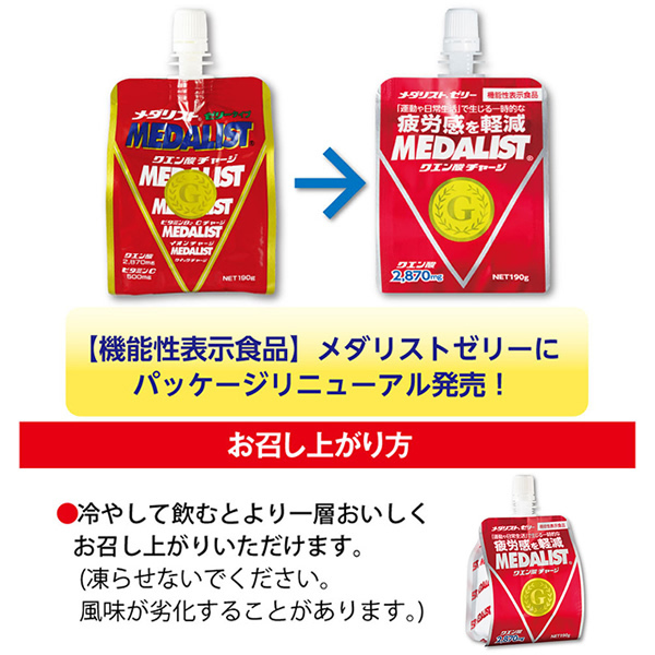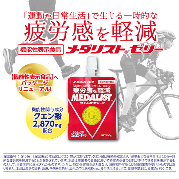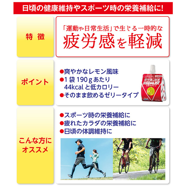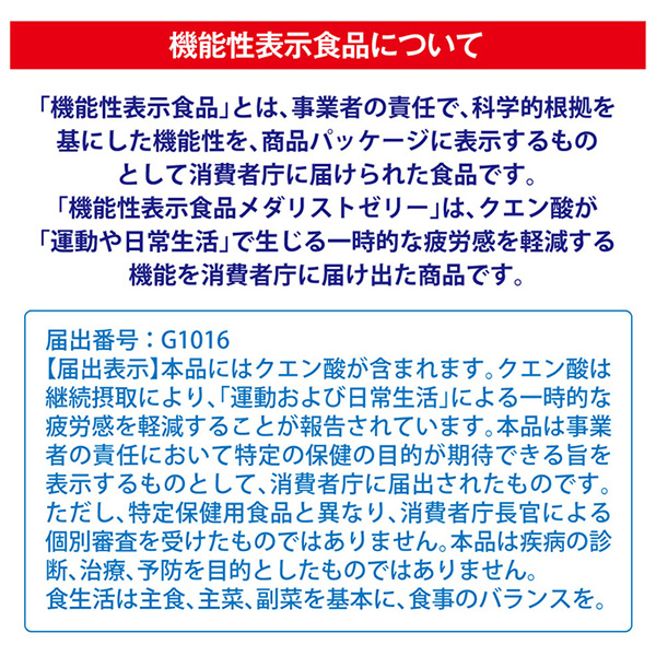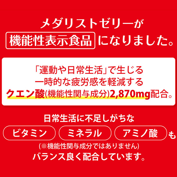 | 【届出表示】本品にはクエン酸が含まれます。クエン酸は継続摂取により、「運動および日常生活」による一時的な疲労感を軽減することが報告されています。 【商品の特徴】 ・溶かさず手軽に飲めるメダリストゼリーが機能性表示食品になりました。 ・栄養成分はメダリストのおよそ2倍の濃度。小容量で効率的に栄養補給できます。 ・クエン酸・アミノ酸に加え、ビタミン・ミネラル等をバランスよく配合。身体に必要な栄養素を、いつでもどこでも手軽に補給することができます。 | ||||||||||||||||||||||||||||||||||||||||||||||||||||||||||||