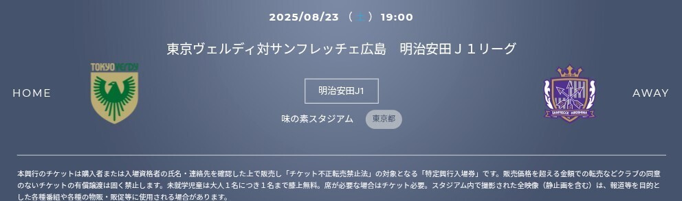 2025年8月23日 19:00 東京ヴェルディ  対 サンフレッチェ広島  チケット サッカー jリーグ 2枚