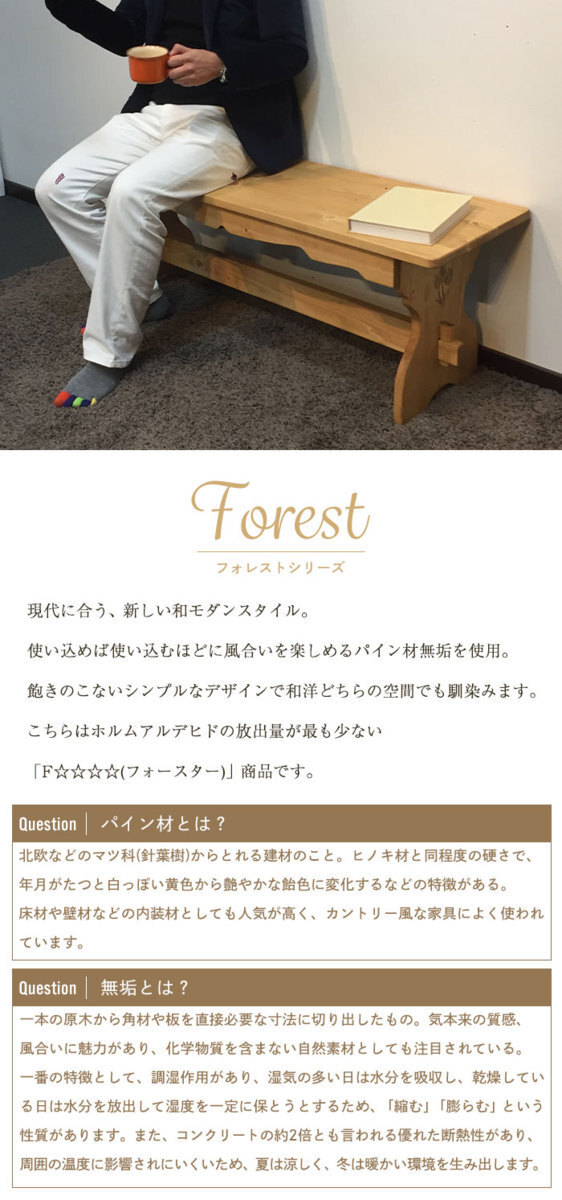| 商品説明 | 現代に合う、新しい和モダン「Forest ~ フォレスト」シリーズ。 高級感と木の温もりを感じられる和モダン・ダイニングベンチ。 使い込めば使うほどに風合いを楽しめる天然無垢材を使用。 座面の長辺の面には波うった「なぐり加工」を施し、曲線をつけた和の雰囲気を醸し出します。 伝統的な楔(くさび)を打ったデザインを採用することにより、強度が上がり、長くご愛用頂けます。 ベンチとしてだけでなく、飾り棚としてもお使いいただけます。 こちらはホルムアルデヒドの放出量が最も少ない「F☆☆☆☆(フォースター)」商品です。 【仕様】 ■製品サイズ:約幅125×奥行35×高さ43cm ■材料:パイン材無垢・水性塗装 ■組立区分:組立品 ■カラー:ナチュラルブラウン ■キーワード:カントリー家具 パイン材 ベンチ高級感 おしゃれ 通販 オススメ 人気 新生活 引っ越し 就職 天然木 木製 無垢 無垢材 洋風 ナチュラル 木目 家具 新生活 通販 就職 天然木 木製 無垢 無垢材 洋風 木目 輸入家具 新生活 自然塗料 フレンチスタイル 北欧スタイル 和風 和モダン 家具 ひとり暮らし家具 二人暮らし家具 売れてる家具 可愛い家具 お洒落な家具 木製ベッド ひとり暮らし家具 二人暮らし家具 売れてる家具 可愛い家具 お洒落な家具 木製ベッド |