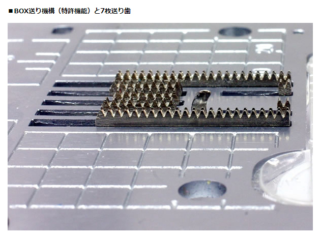 エクシードには、JUKIが特許取得済みの送り歯機構(BOX送り方式)、家庭用ミシンで最高クラスの貫通力・縫製スピード、金属フレーム・金属部品を用いた抜群の耐久性など、他メーカーよりもワンランク上の性能、機能を搭載することで、洋裁のプロの方を中心に評価され、いまでは初心者でも使いやすいミシンとして、認知されるようになりました。