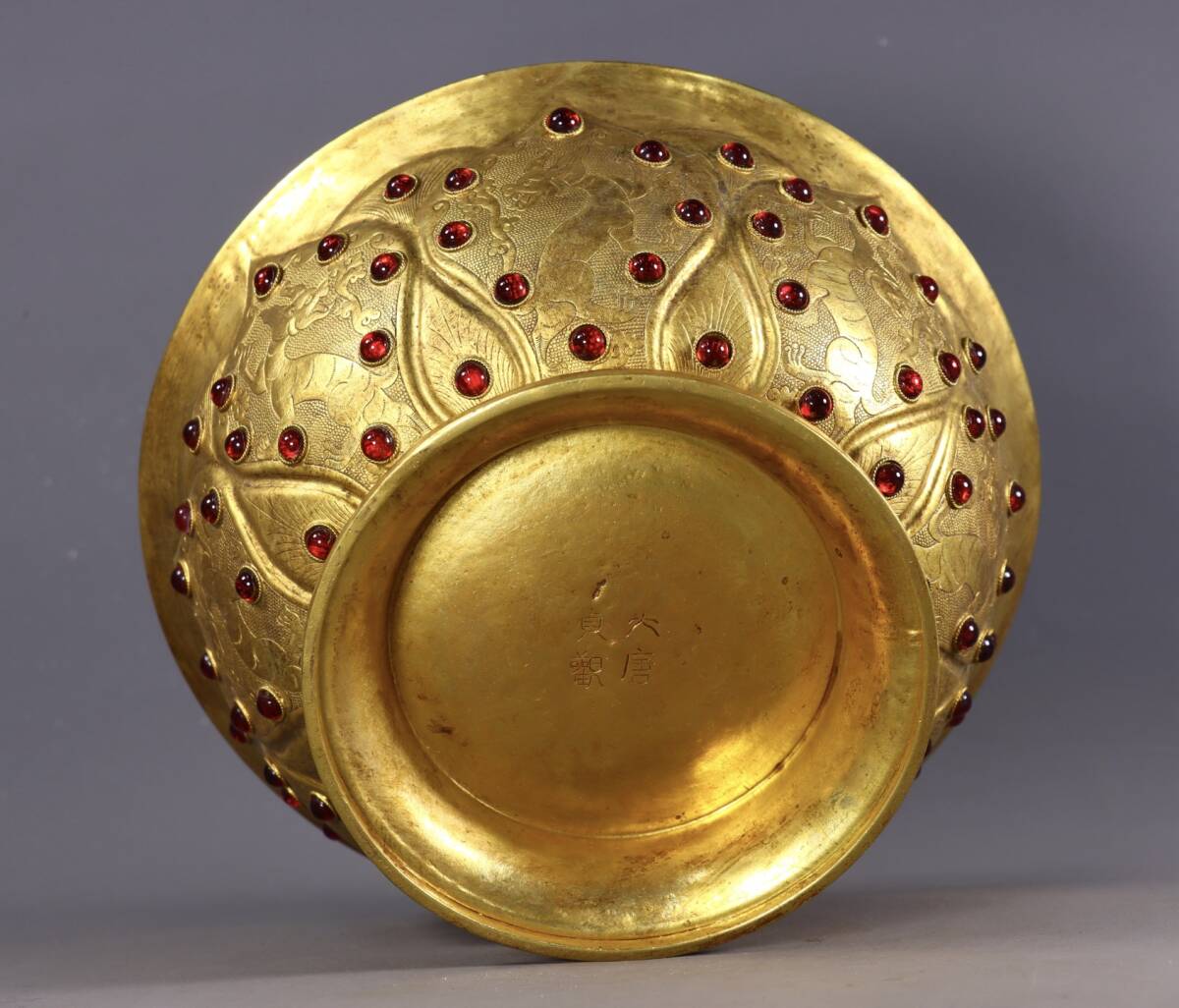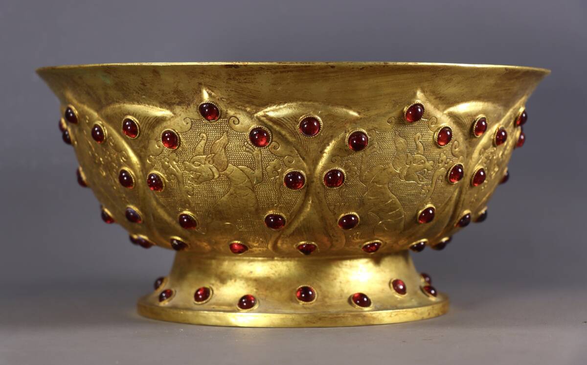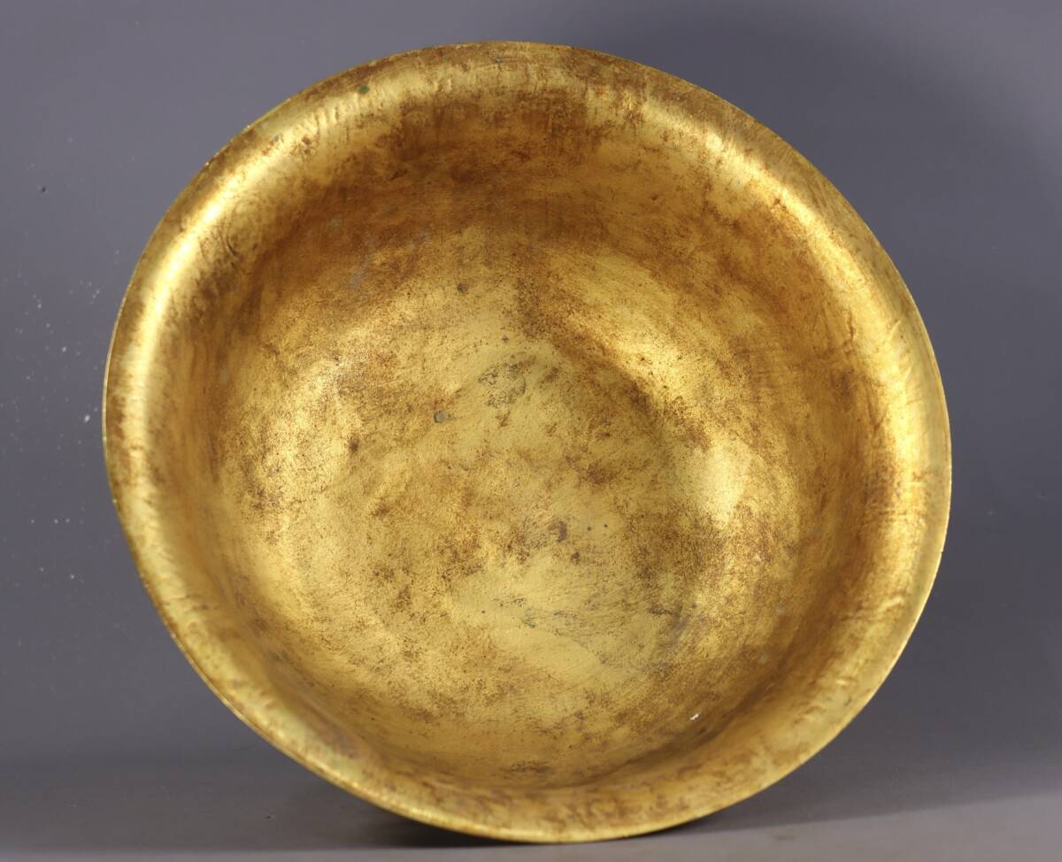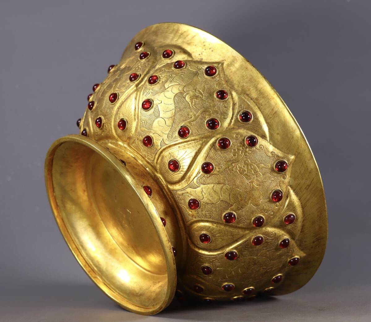旧蔵 清 純手工鏨刻 銅塗金 モザイク寶石 大碗 銅製品 銅器 極細工 中国古玩 骨董品 古美味 208