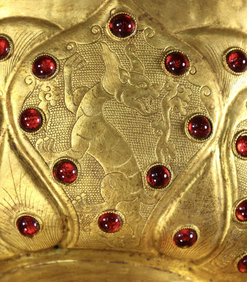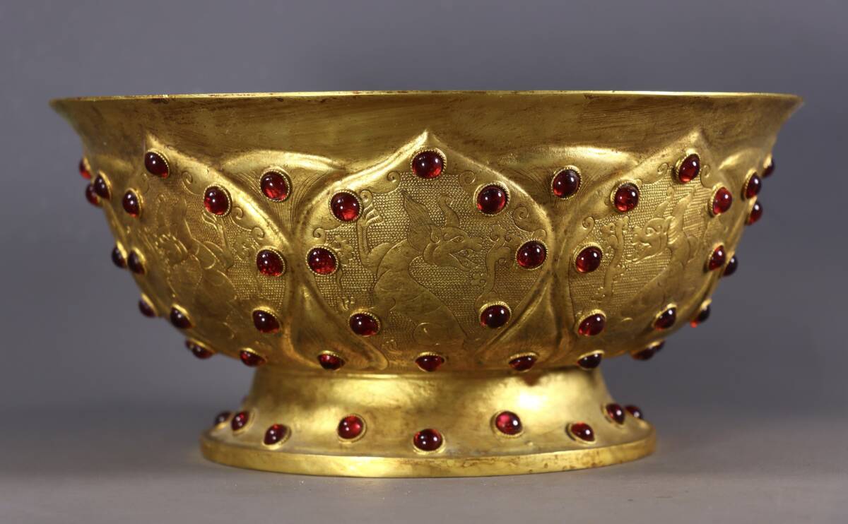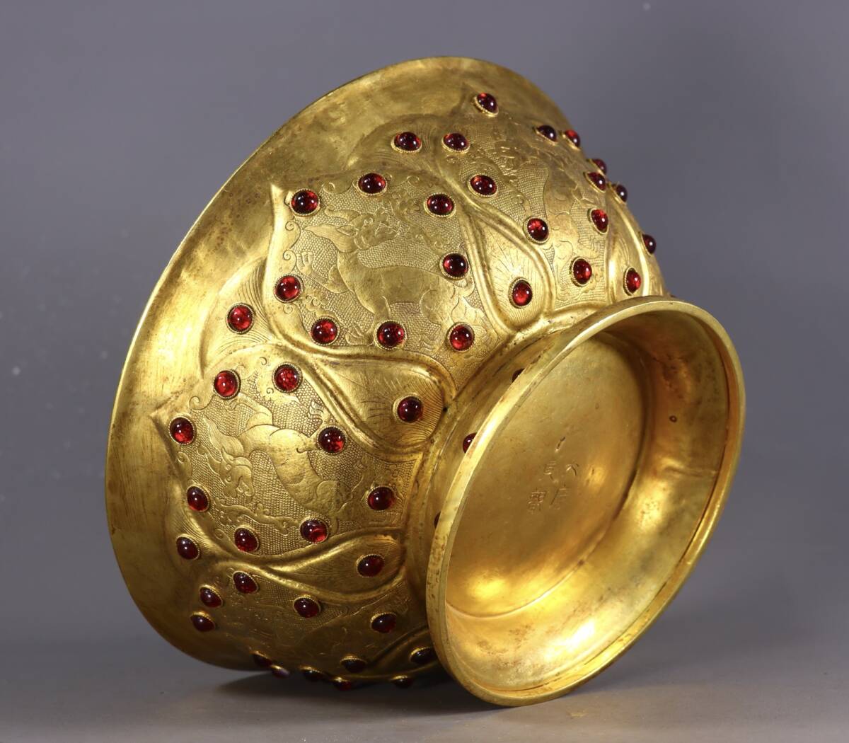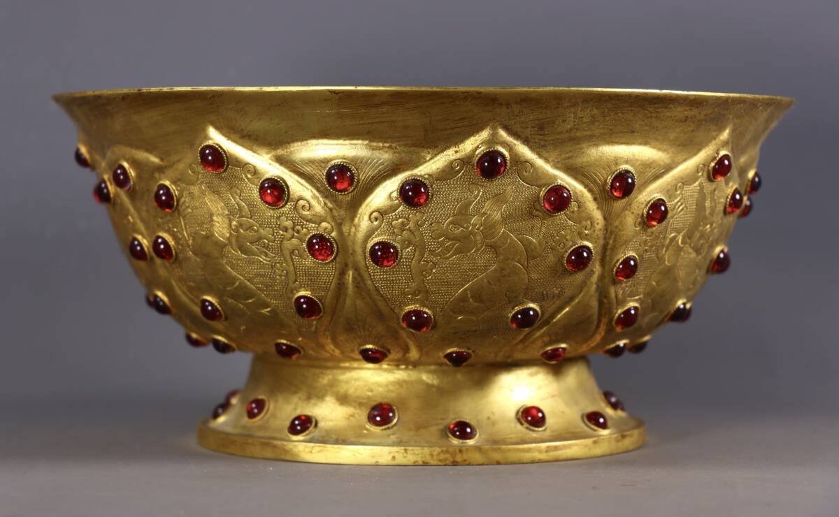旧蔵 清 純手工鏨刻 銅塗金 モザイク寶石 大碗 銅製品 銅器 極細工 中国古玩 骨董品 古美味 208