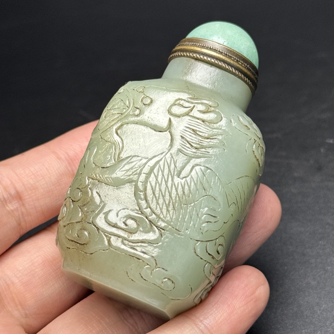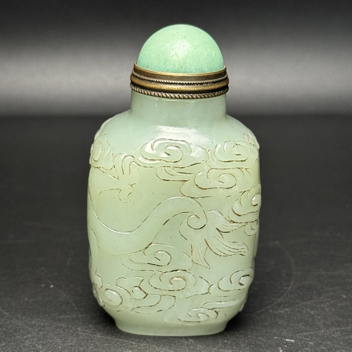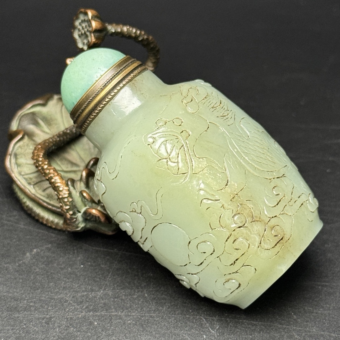 *珍品旧蔵* 清 玉彫 和田玉 飛龍鼻煙壺 祥雲相伴 玉質温潤 包漿醇厚 極細工 中国古玩 骨董品 古美味 H48