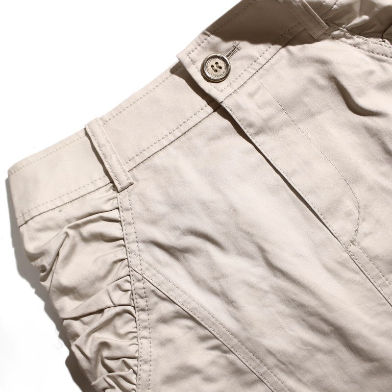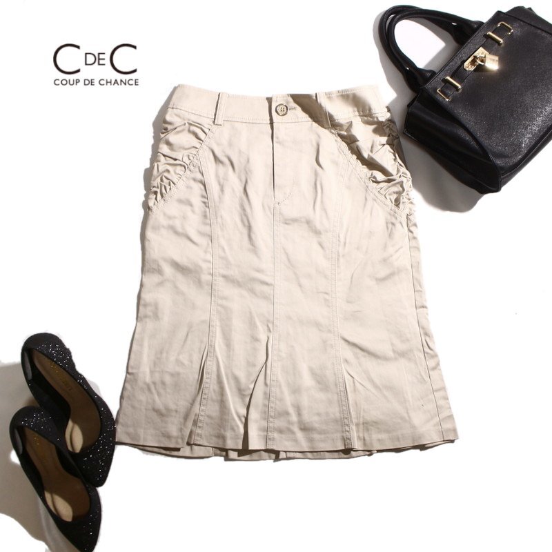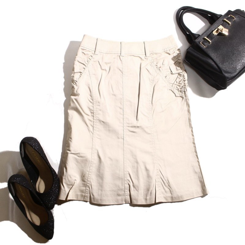 美品 クードシャンス COUP DE CHANCE 株) ワールド 春 夏 ギャザー デザイン ハリ 艶 ストレッチ タイトスカート 7号 36 ベージュ オフィス