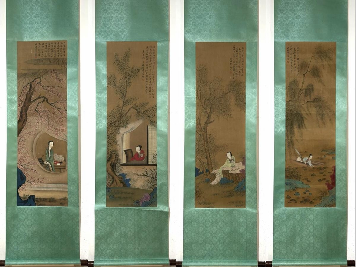 「費丹旭畫 仕女図四條屏」清代画家 肉筆絹本【仁】掛け軸 書画立軸 巻き物 中国書画 古美術 蔵出 畫芯約31×103cm