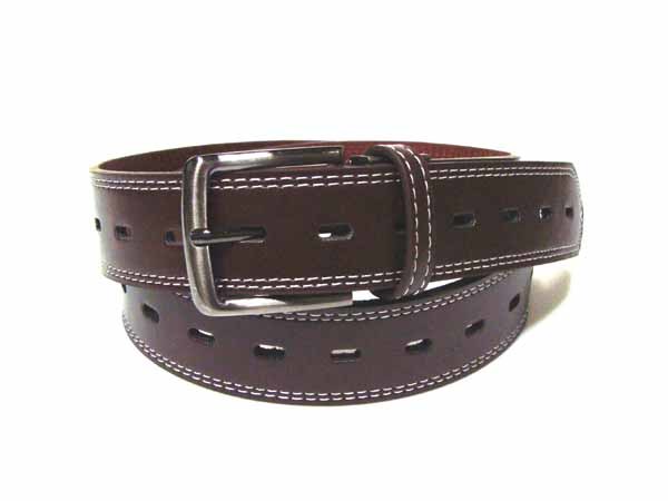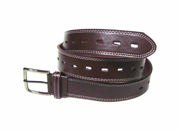 何処にでも留められるエンドレスピンホールにダブルステッチ加工された少し肉厚のあるブラウンカラーの牛革使用ベルトです。