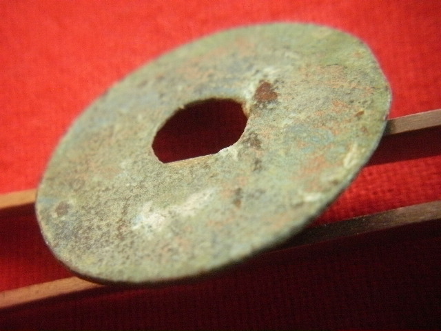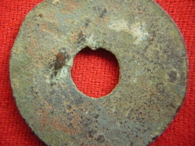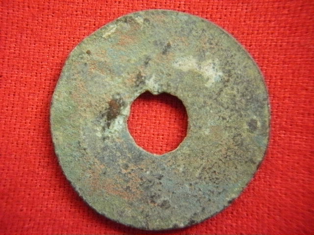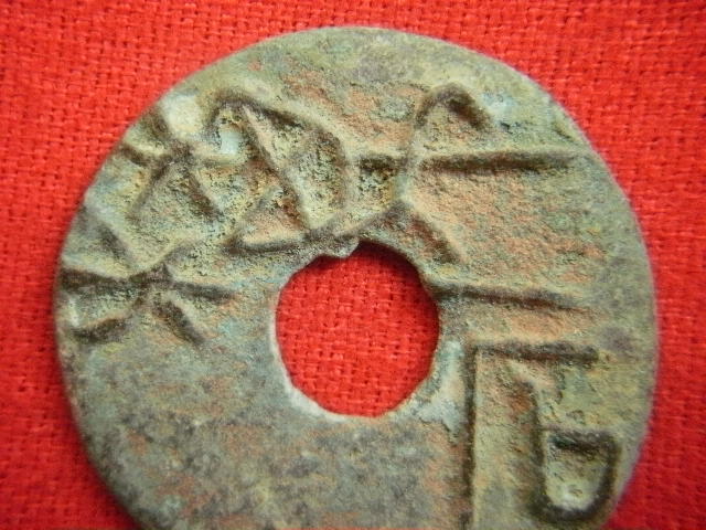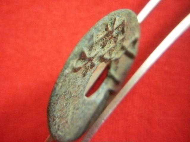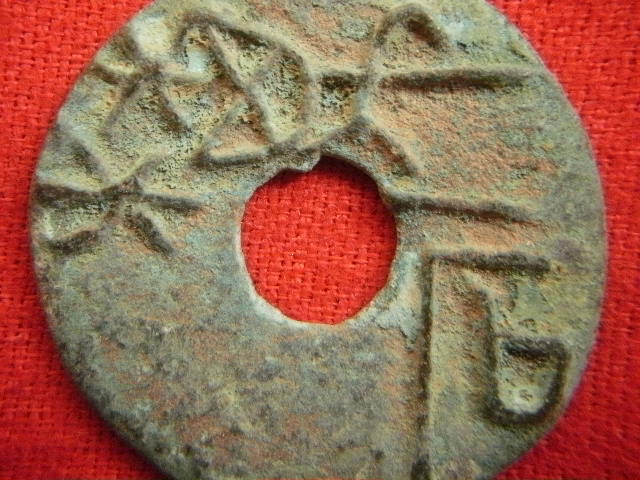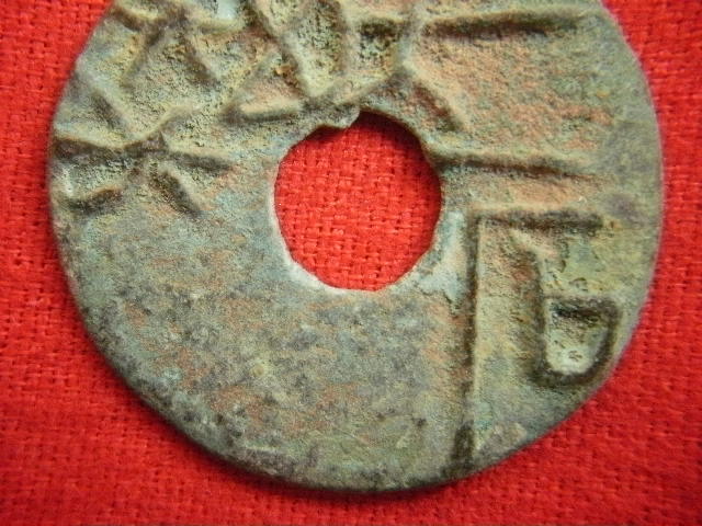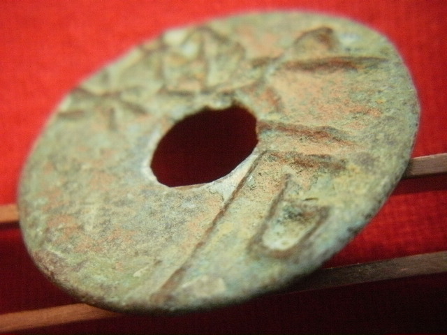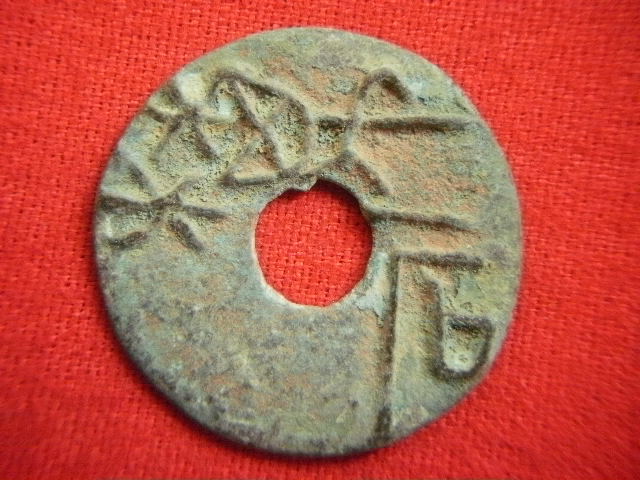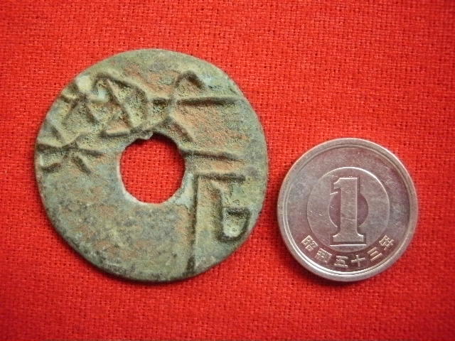 中国の穴銭・絵銭・厭勝銭 ( 中国古代銭 ? 円孔銭 ? 垣字銭 ? 離石 ? ) としましたが私見、真贋や材質等詳細不明、画像を参考にご検討ください。状態は、中古並品~クラスかと思います。本絵銭の材質は不明、磁石には反応しません。外観は経年による使用感があり、古キズや汚れ、変色や青サビ等がありますので画像も参考にしてください。絵銭の大きさは、外径約32.4~34.9㎜ほど、最大厚み約2.1㎜ほど、量目約8.10gほどですが、採寸等につきましては当方による実測値、多少の誤差があるかと思いますのでご承知ください。なお、量目測定には貴金属比重計 (ALFA MIRAGE GK-300) を使用しました。商品タイトル及び商品説明と画像に相違ある場合は、「画像最優先」とさせていただきますのでご承知ください。画像の1円玉は大きさの比較用、出品物の対象外です。実物の色はご使用のモニターやブラウザによって若干異なる場合があるかと思いますのでご承知ください。その他、見落としによる記載漏れや誤記等にご考慮ください。神経質な方や完璧品をお望みの方は、入札をご遠慮ください。申し訳ございませんが、画像を参考にノークレーム、ノーリターンでお願い致します。送品は、定形外普通郵便(送料=110円、投函後の郵便事故補償なし)を利用の予定ですが、補償付き郵便(別途=350円、簡易書留便)にも対応、お申し出ください。代引き便やその他の運送便の取り扱いは致しておりませんので重ねてご承知ください。入札前に自己紹介欄もご覧ください。同梱につきましては同日落札分のみとさせていただきますのでご承知ください(同梱可能品に限る)。