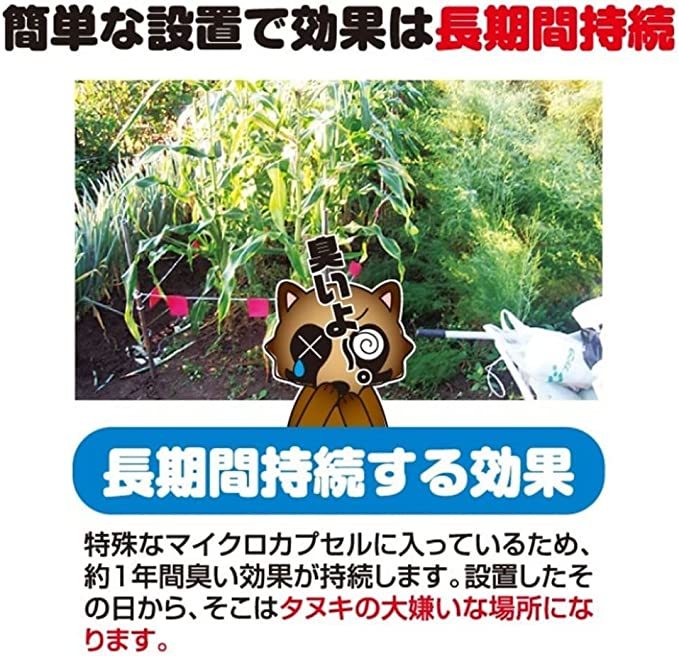 長期間効果が持続!特殊な微細マイクロカプセルに入っているため、約1年間効果が持続します。設置したその日から、そこはタヌキの大嫌いな場所になります。