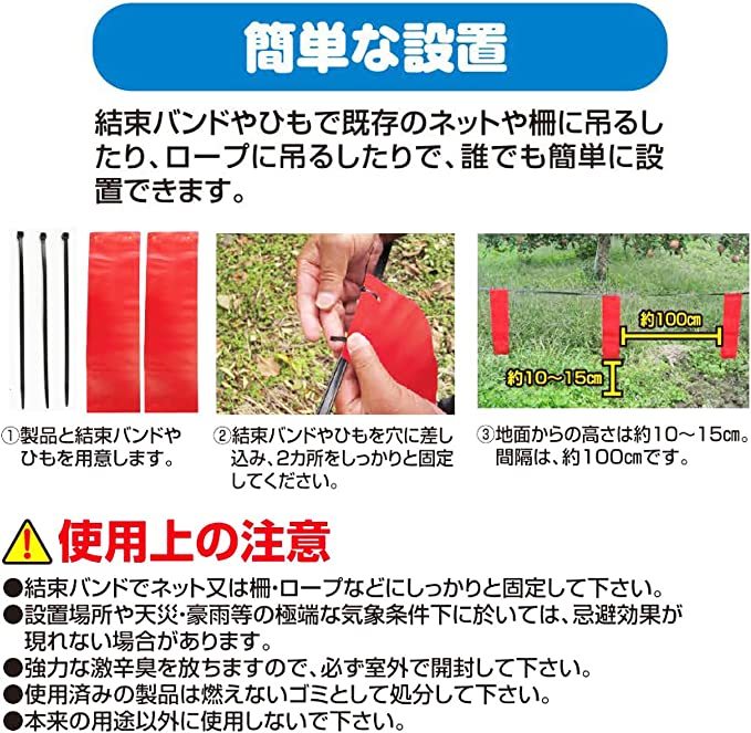 結束バンドで既存のネットや柵などに吊るすだけの簡単設置。