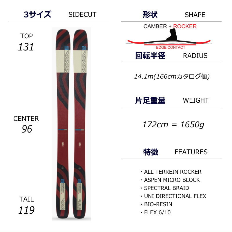 ・ブーツの幅よりもギリギリ狭い96mmのセンター幅はオンピステでは足裏で直接滑っているようなエッジのダイレクト感があり、パウダーでも高い浮力を発揮。スピード感のあるフリーライディングを楽しみたい方におすすめのセンター幅です。