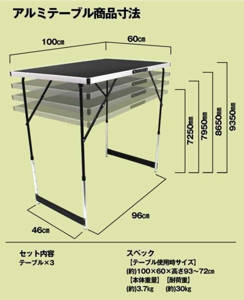 なんと3台セットです♪ 1台で使うも良し、複数台組み合わせて使うも良し。 あらゆるシーンで大活躍するテーブルです。 天板に水や汚れに強い防水加工! BBQの食材や調味料を置くテーブルとして使えます! ハンドル付きなので、持ち運び楽々♪ 【商品仕様】 ・カラー:ブラック ・商品外寸(約):幅1000×奥行600×高さ7250〜9350mm(高さ4段階) ・商品重量(約):3.7kg ・耐荷重(約)30kg 【商品内容】 ・本体 ×3 【注意事項】 ・海外製品で、簡易梱包での輸入のため風防に擦れや多少の小キズなどがある場合がございますが、商品自体には問題ありませんのでご了承下さい。 ・商品は、モニターによって色合いが異なって見える場合があります。 ・仕様・デザインは改良のため予告なく変更することがあります。 |