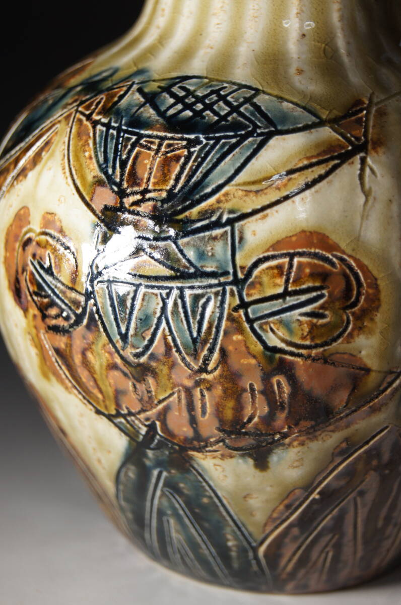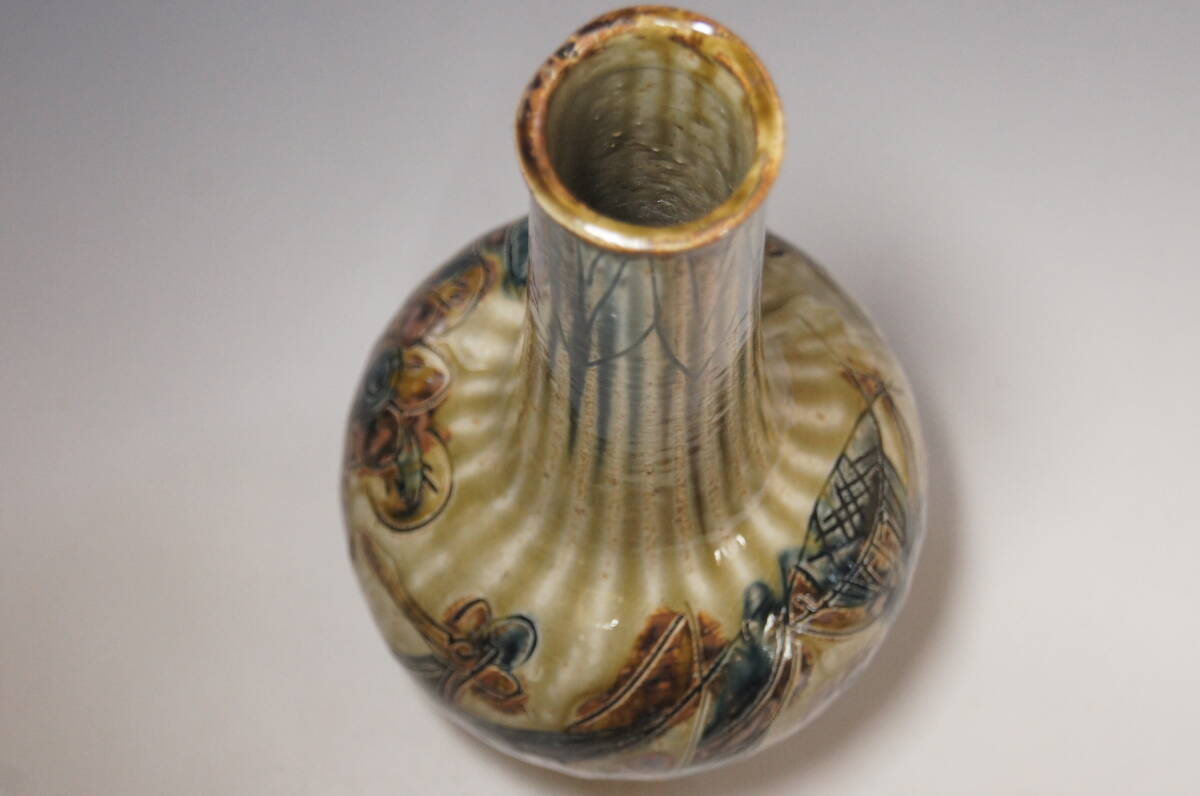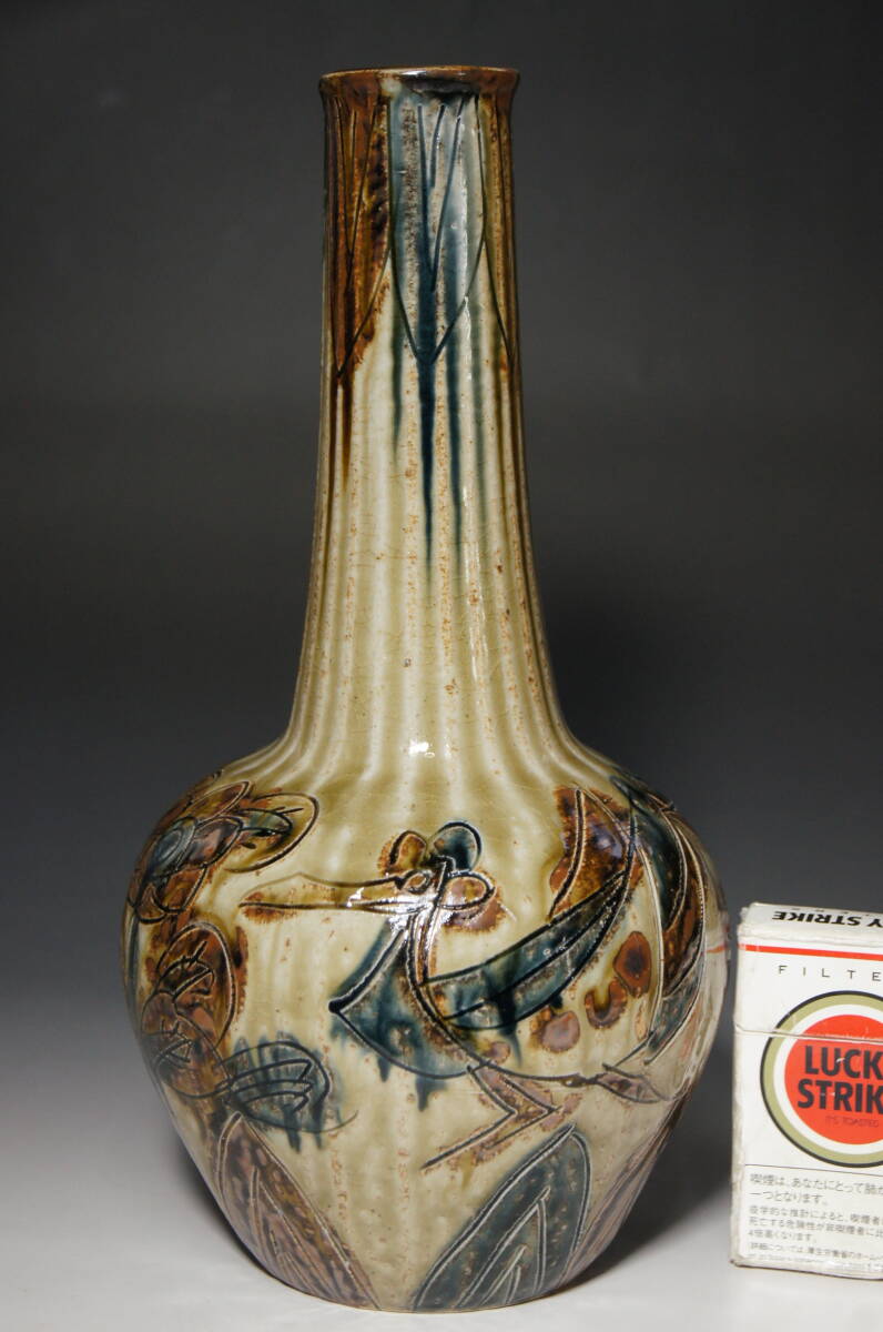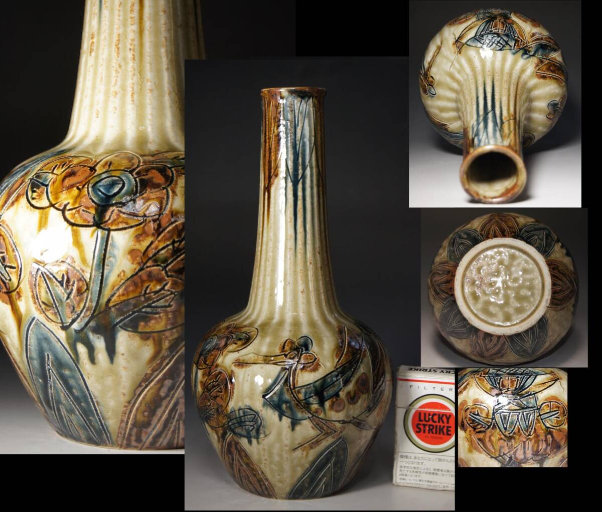 ヨーロッパ イギリス? アンティーク 彩釉 鎬 花鳥図 花瓶 フラワーベース 民藝 民芸 鶴首 花器 花生 花入 飾壷 | |||