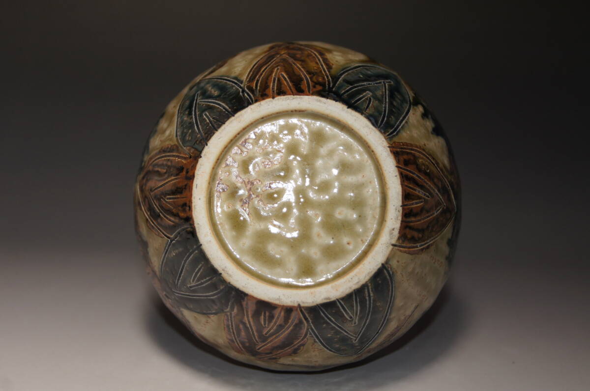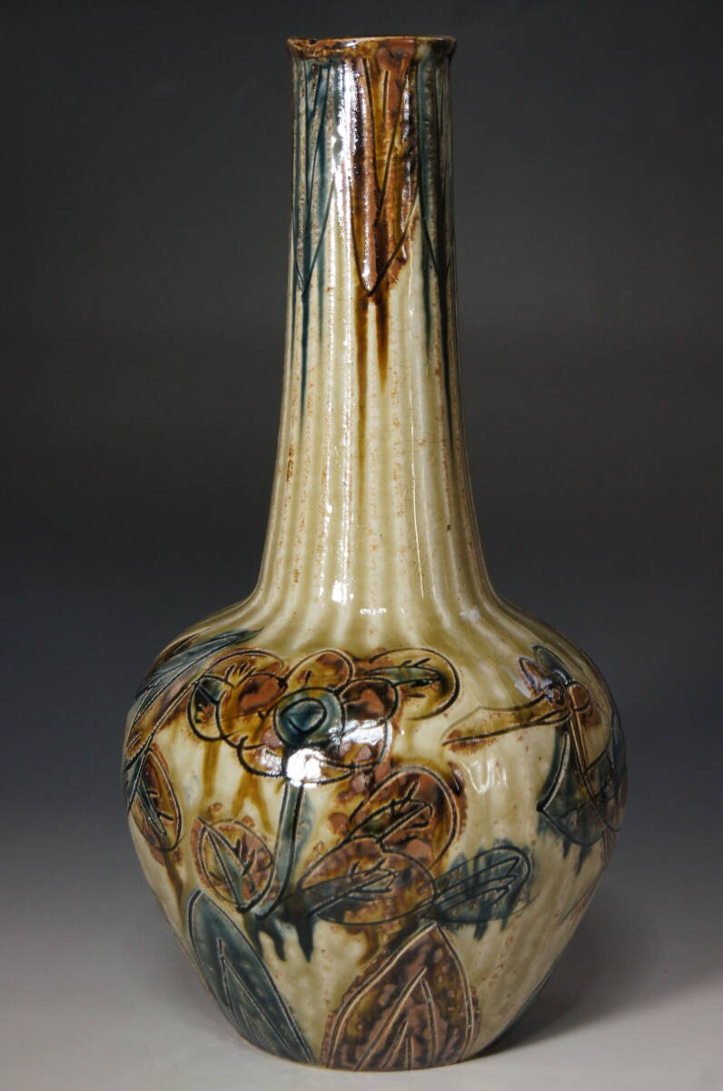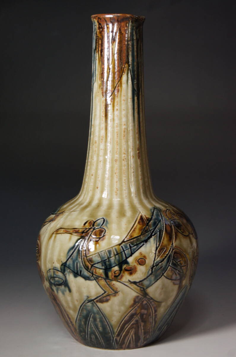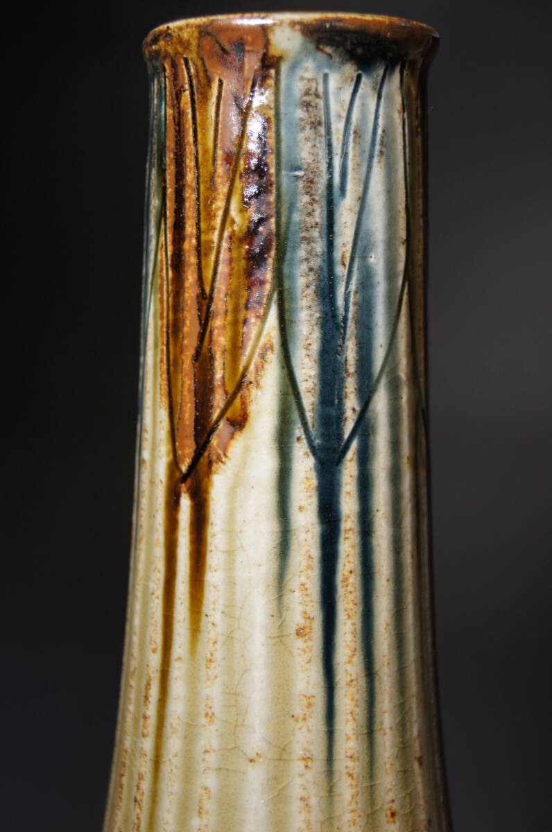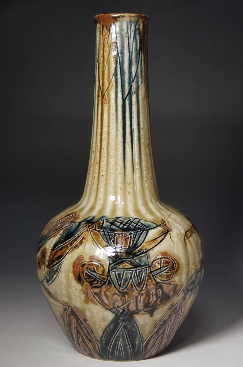 ヨーロッパ イギリス? アンティーク 彩釉 鎬 花鳥図 花瓶 フラワーベース 民藝 民芸 鶴首 花器 花生 花入 飾壷 | |||