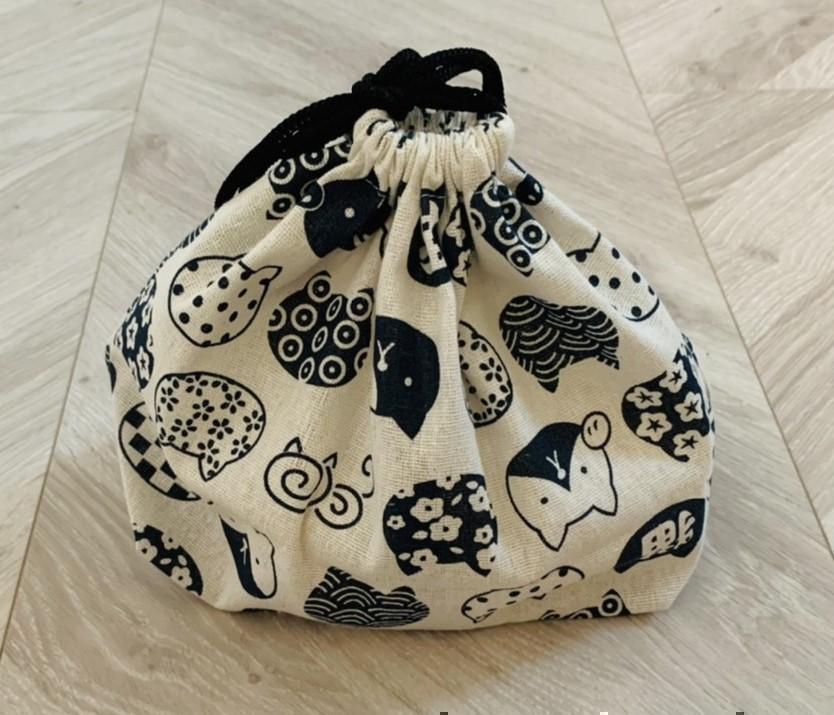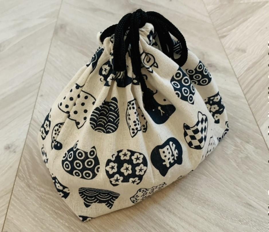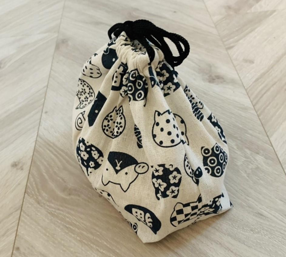 両端が開閉できるシンプルな巾着ランチバッグ、使いやすさ。 バッグに入れたり、持ち運んだりできます。