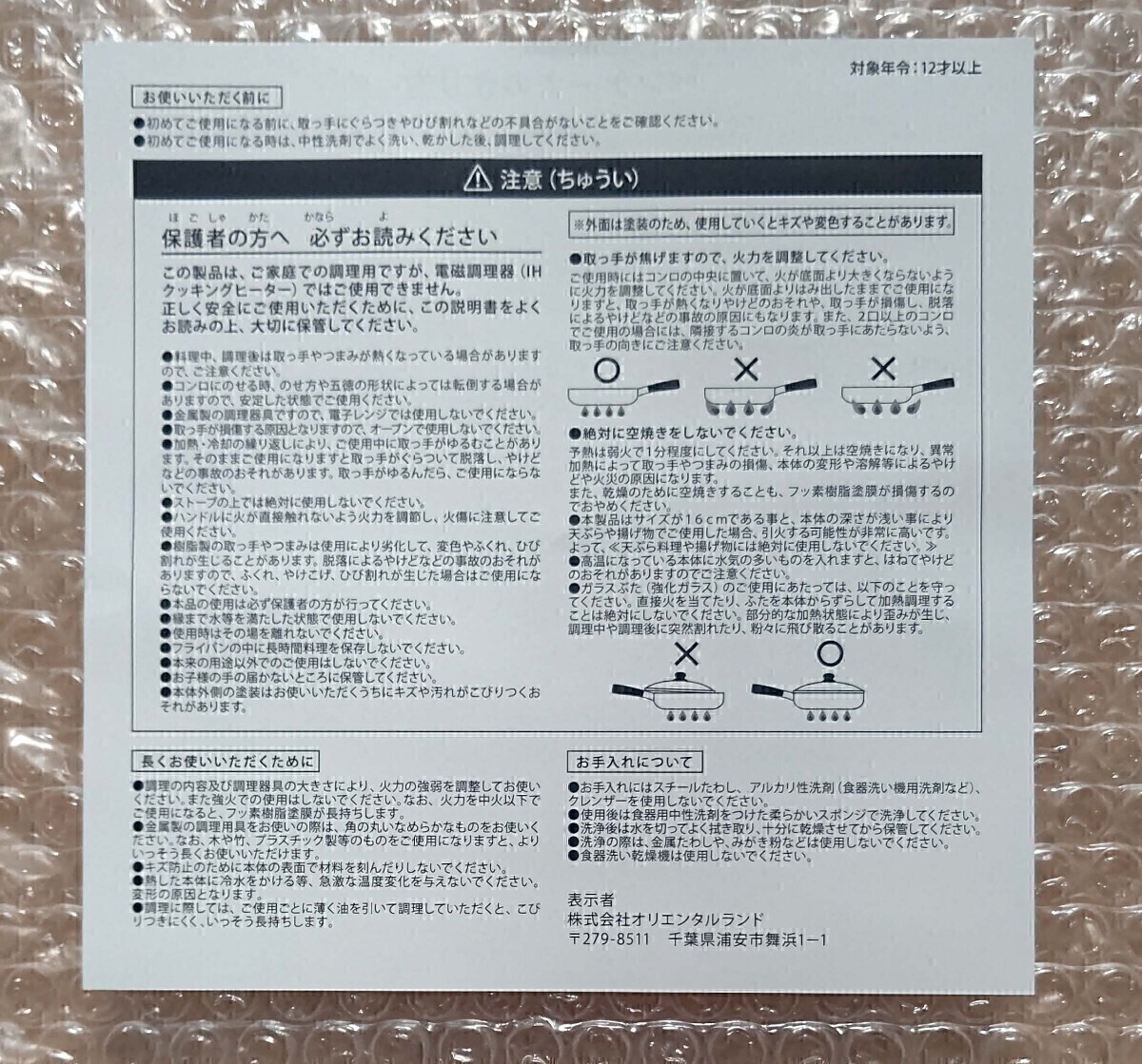 未開封のまま保管していましたが出品のため開封しました。フライパンは未使用品です。説明文は両面印刷されています。