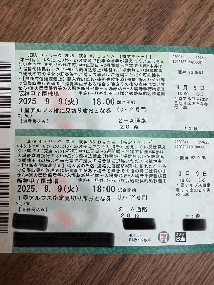 9月9日(火)阪神タイガース vs 横浜DeNAベイスターズ戦 1塁アルプス指定見切り席 2枚(連番)